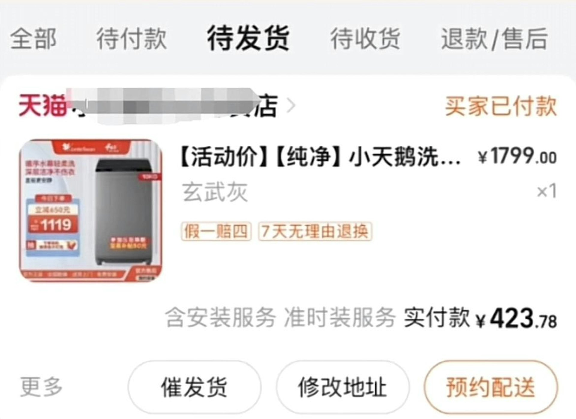 據「小天鵝東山專賣店」公告,由於運營人員價格設置錯誤,導致全店洗衣機產品遠低於市場價造成店舖巨大損失,在短短的20分鐘內有超過4萬個訂單,其中大部份訂單為一人多台。據核算,本次事件下單金額近4000萬元,貨物價值超7000萬元,這意味著如果按規定發貨該店將直接損失超3000萬。+ i# m0 ~3 g" a$ C& A