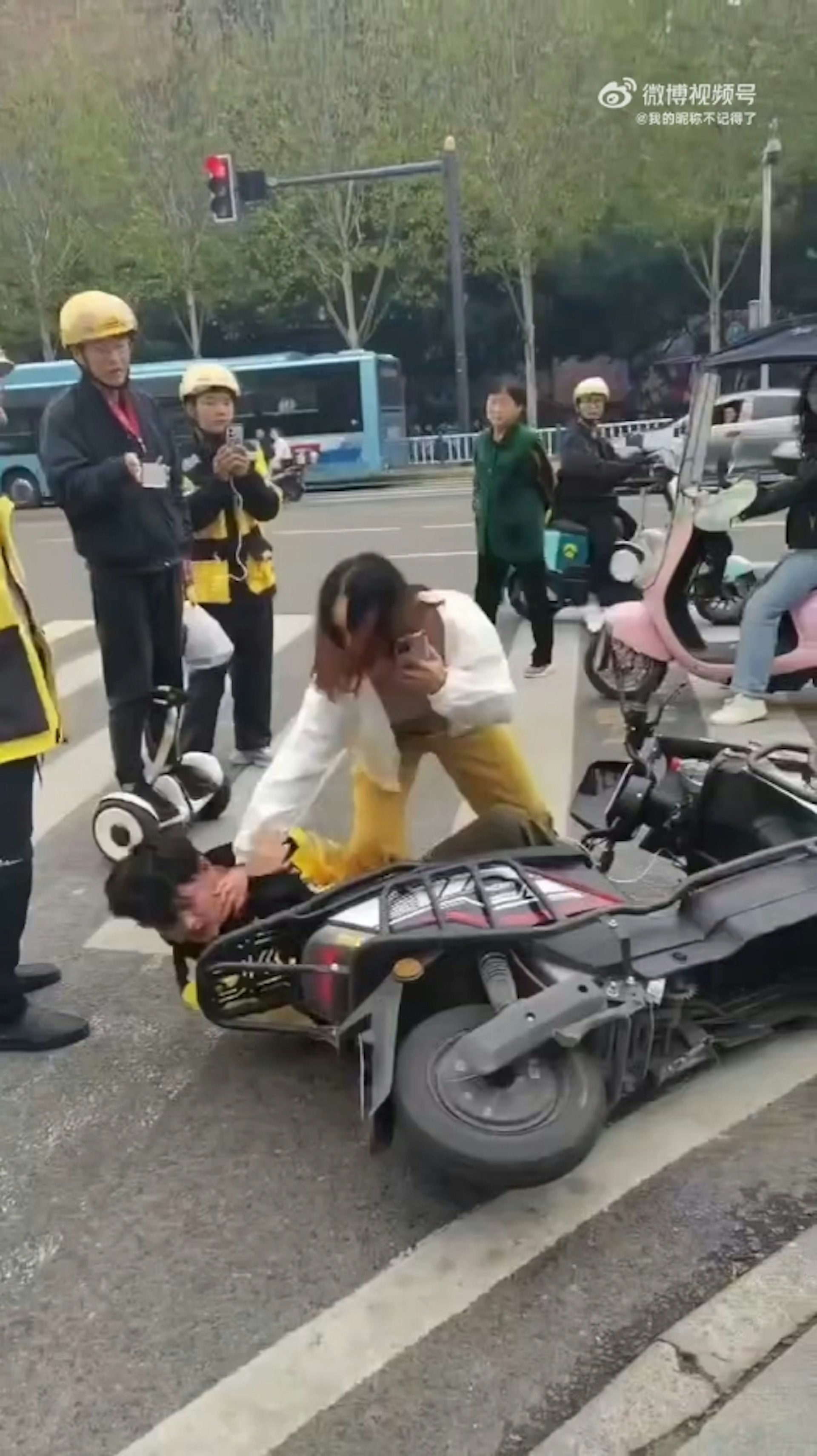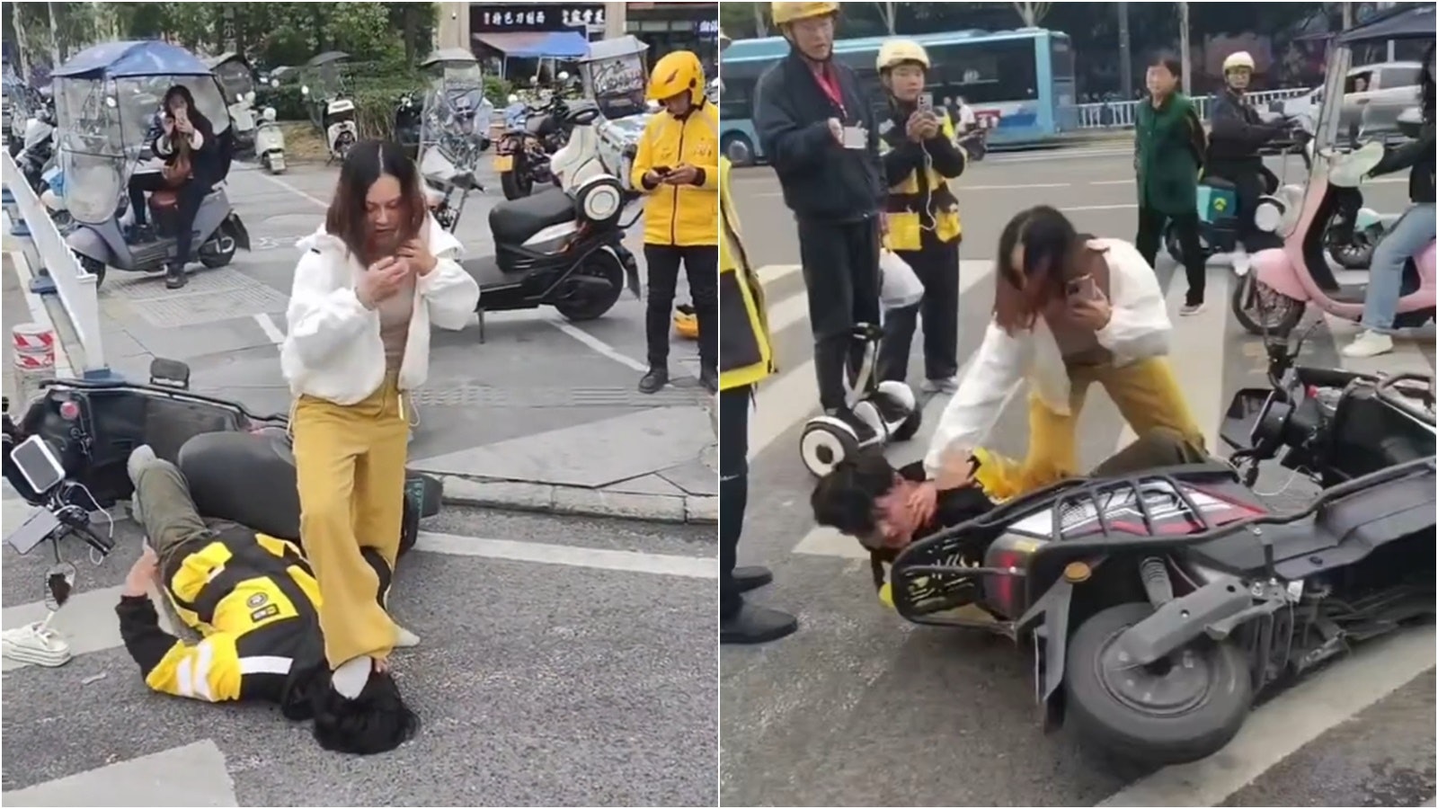 外賣員坐在馬路邊的石柱上,突然被一名醉酒女子用手拉扯,兩人一同倒地。(影片截圖)