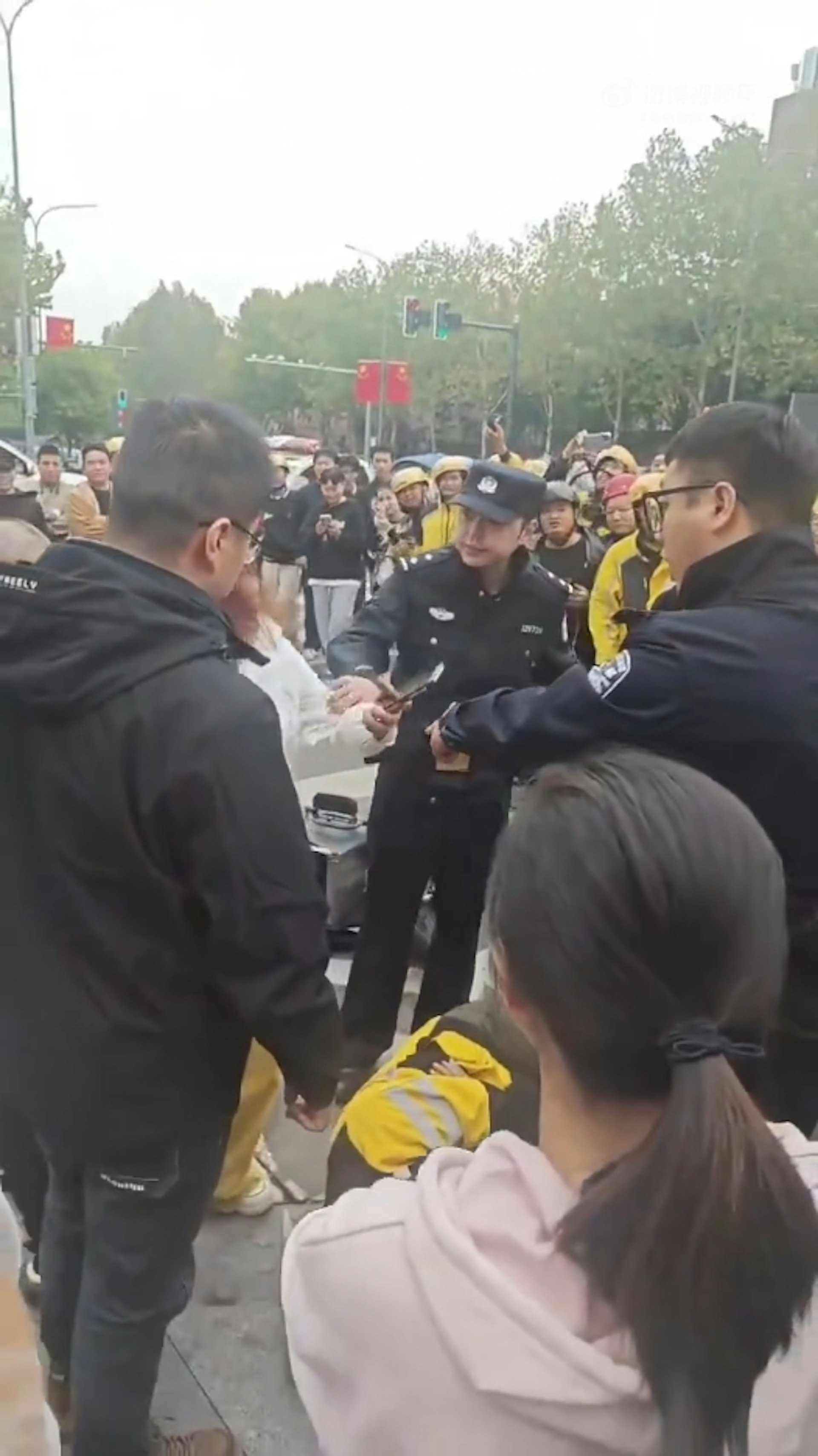 , @6 w4 j/ l/ Y4 h5.39.217.77:8898外賣員坐在馬路邊的石柱上,突然被一名醉酒女子用手拉扯,兩人一同倒地。(影片截圖)