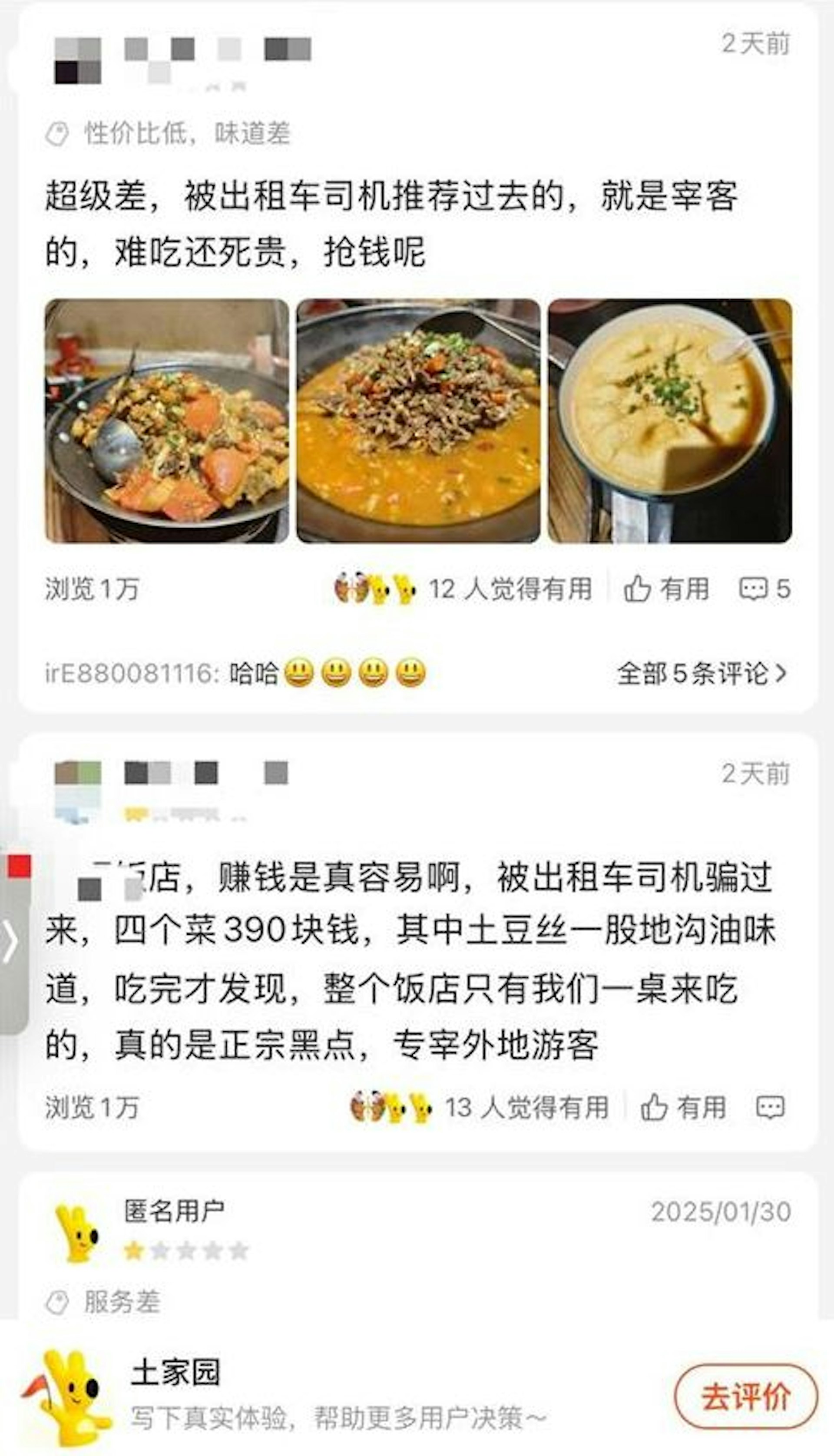 劉女士認為,的士司機及餐廳聯手設局讓他們中計。事後,其將上述經歷整理成圖文,於社交平台上公開。(極目新聞)