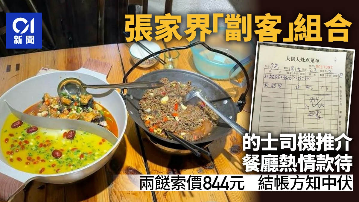 網民近日發帖爆料,指自己和男友在湖南張家界旅遊時,疑被的士司機及餐廳聯手「劏客」,點了兩個分量不多的菜,竟被收費844元人民幣,「一看賬單,差點沒暈過去」。周四(6日),張家界市永定區旅工委辦公室通報表示,已責令涉事經營主體停業並對其進行立案調查。