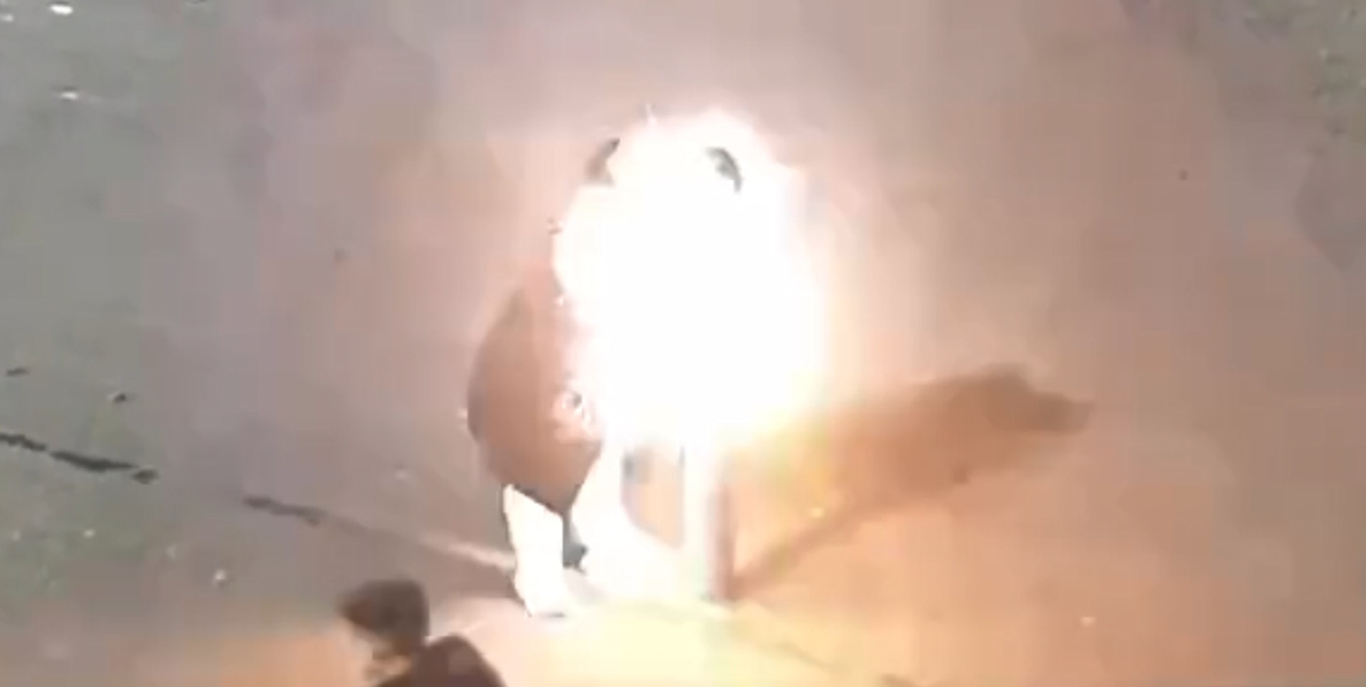 閉路電視影片顯示,事發時一名穿黑色大衣的中年男子一手抽著煙,另一手拿著半個人高的禮花彈,放在路口旁準備燃放。公仔箱論壇, a" L1 p* W4 E, c6 M( t& {: o: p