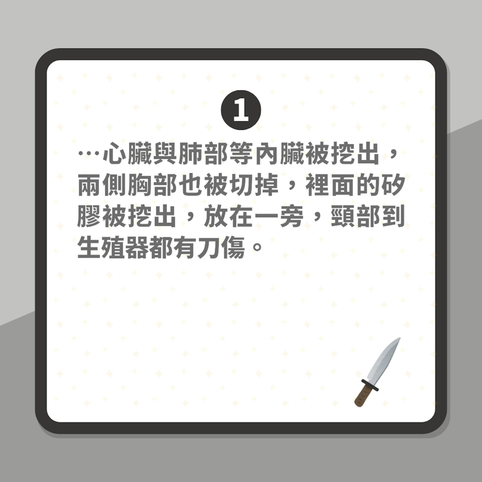 警方在現場勘查時發現,死者的心臟與肺部等內臟被挖出,兩側胸部也被切掉,裏面的矽膠被挖出,放在一旁,頸部到生殖器都有刀傷。此外,現場血跡量卻異常偏少,懷疑疑犯事後用毛巾吸走大量血液,並清理現場、擦拭痕跡。TVBNOW 含有熱門話題,最新最快電視,軟體,遊戲,電影,動漫及日常生活及興趣交流等資訊。6 [' c/ P) Y1 u0 w6 G