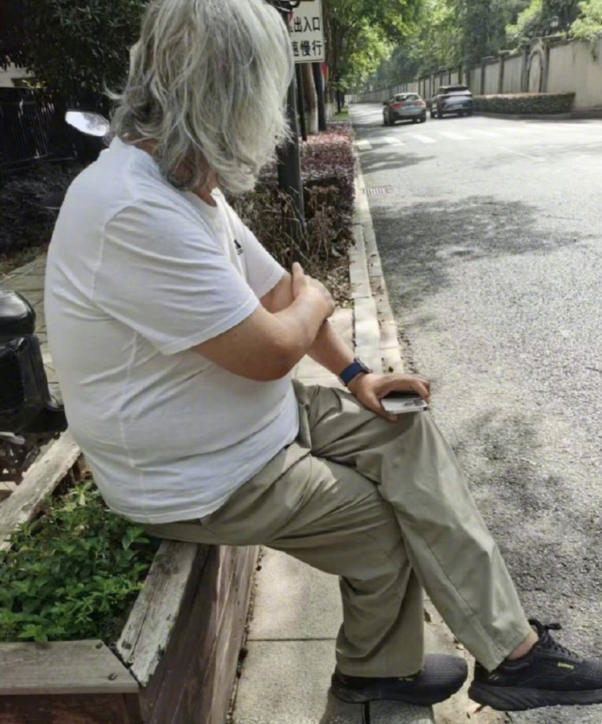 照片中,張紀中滿頭白髮,穿著白色T恤和卡其色褲子,等待交警的,他坐在路旁花壇邊,凝視著不遠處的兩台事故車,有點鬱悶。. _; a9 Q0 w( L1 r) M7 n! t8 M' X