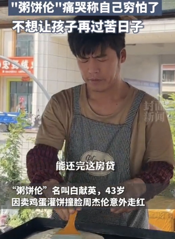 儘管已打響知名度,「粥餅倫」仍腳踏實地做生意,他曾邊哭邊受訪稱自己只因想存點積蓄,不想讓孩子再過苦日子。* F3 Y3 |" y9 K: H# m* q' P2 T
