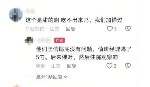 據內媒《極目新聞》報道,影片的發佈者仍在醫院接受治療,他透露,當日的值班經理當着大家的面,宣稱火鍋沒有問題,還連喝了5勺湯。但是身體還是出現了不適,和其他10位顧客一起送往醫院進行了催吐。