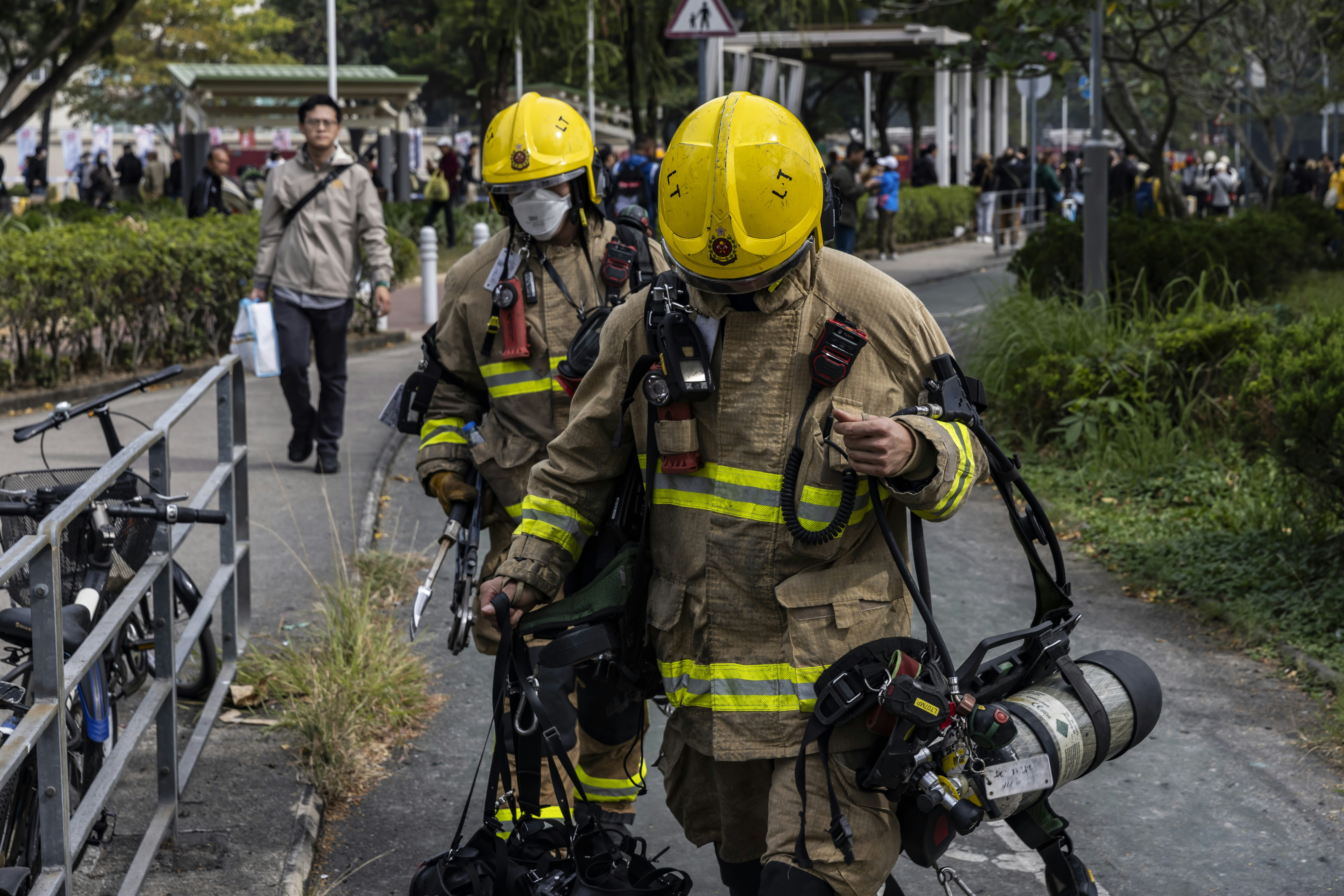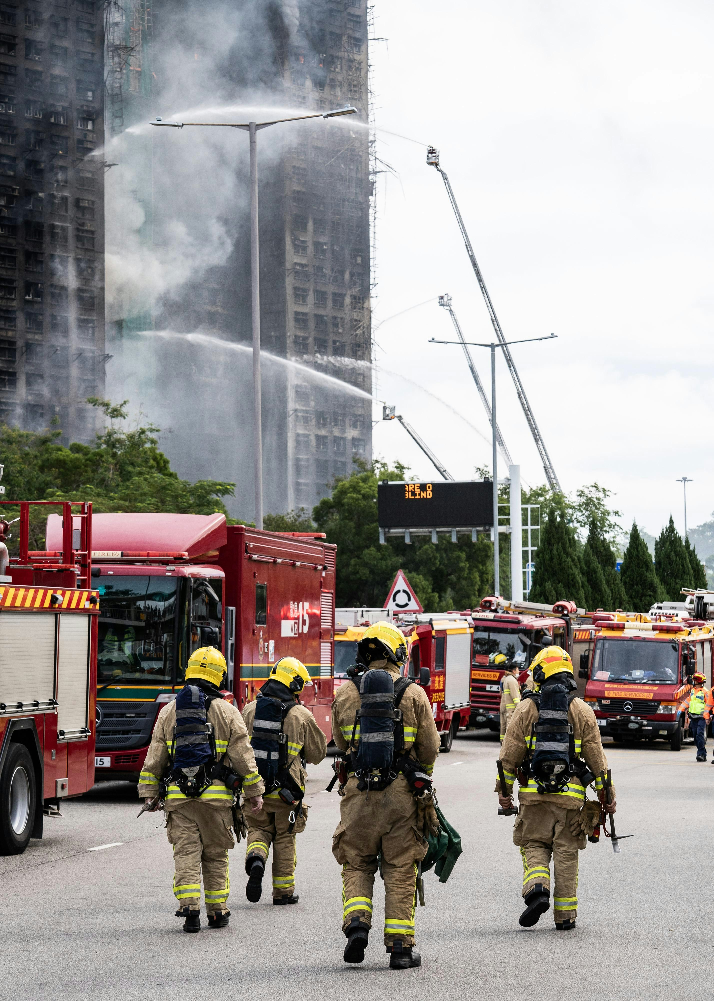 圖為 2025年11月27日,大埔宏福苑五級火後,消防人員續在現場進行救援工作。 (Getty Images)