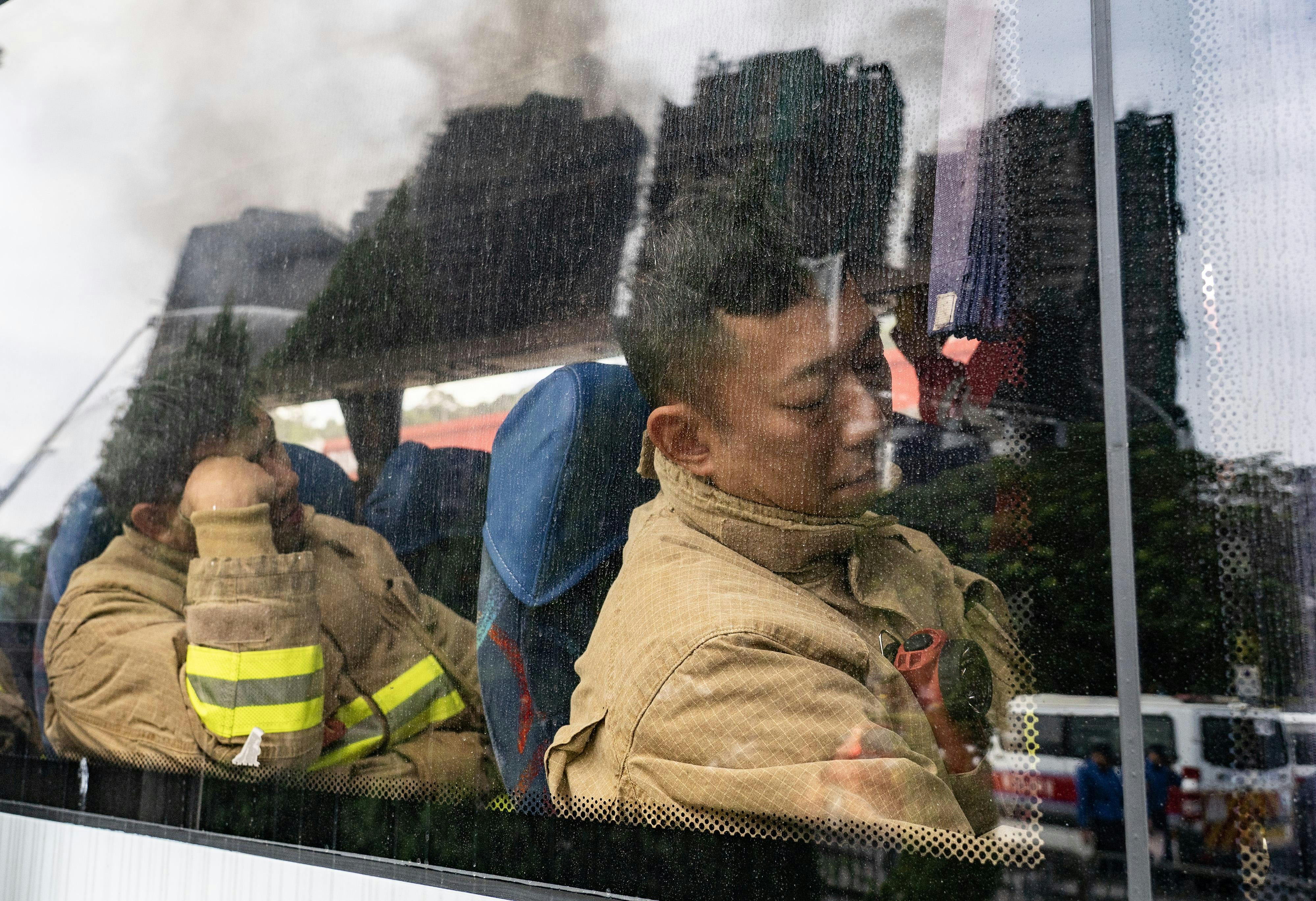 圖為 2025年11月27日,大埔宏福苑五級火救援工作持續,輪班消防員在現場稍作休息。 (Getty Images)