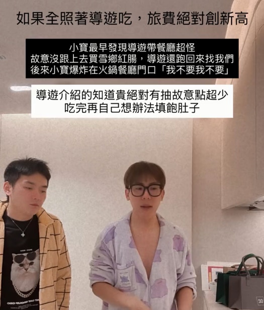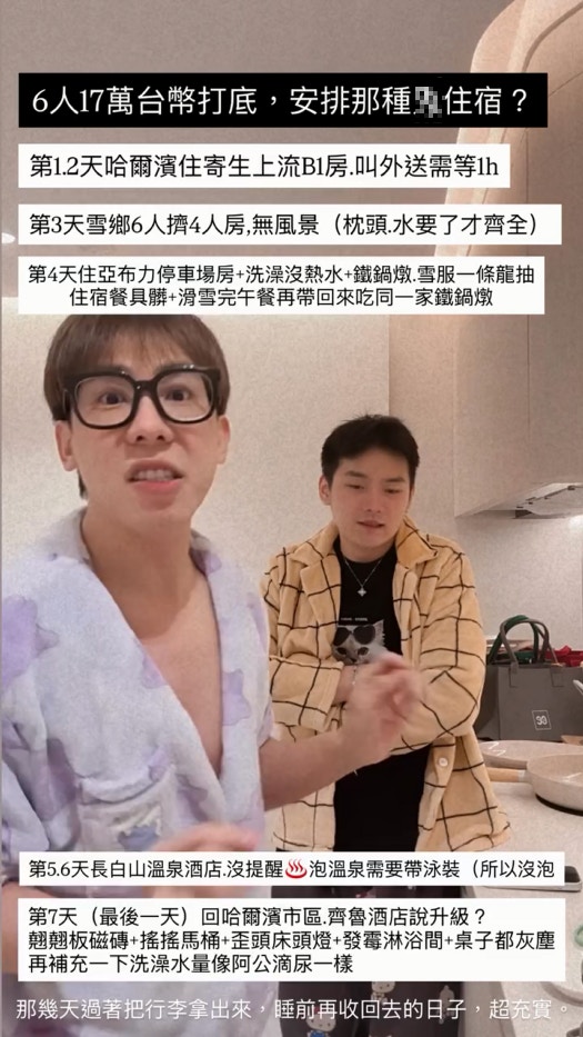 為了避開導遊推薦的餐廳,一行人過得戰戰兢兢,林進表示若不反抗「旅費絕對創新高」。住宿條件更是慘不忍睹。前兩天被安排住在像《上流寄生族》般的B1房,叫外賣竟要等一小時;第三天在雪鄉六個人擠四人房,不僅沒風景,連枕頭和水都要三催四請才補齊。第四天洗澡沒熱水,餐具髒到不行。