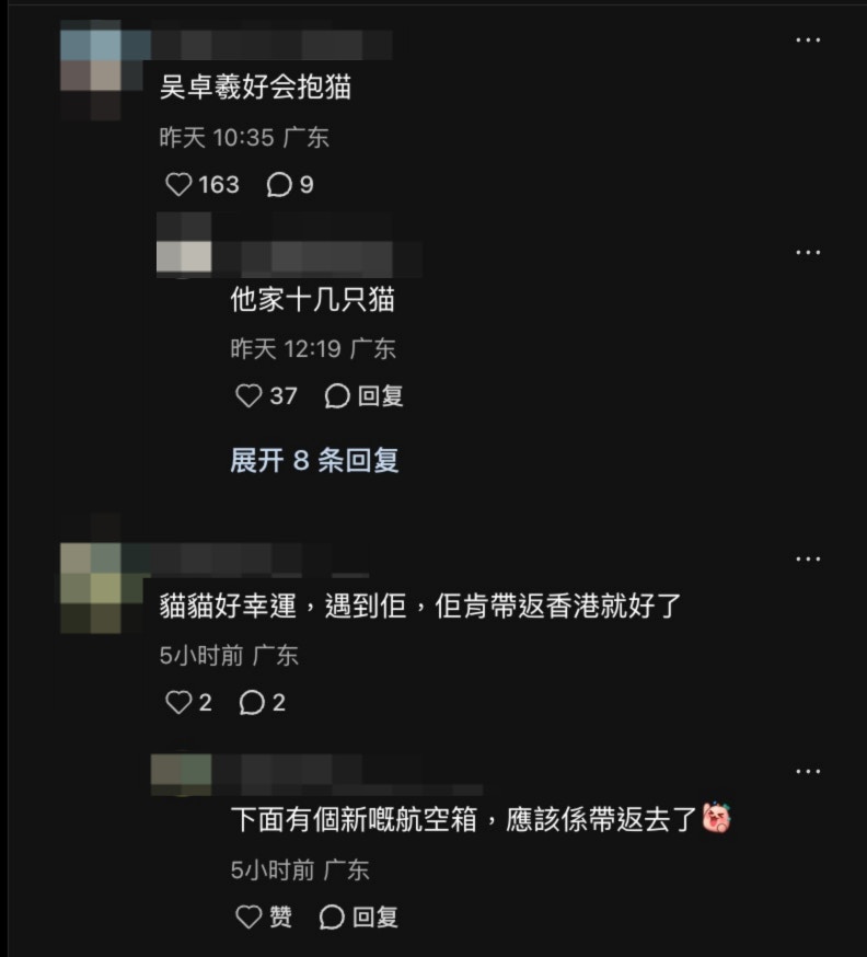 據網民透露,這隻貓咪是吳卓羲在當地拍劇時遇見的流浪貓。而更令人感動的是,正當大家希望吳卓羲能把貓咪帶回香港時,有眼利的網民則發現,吳卓羲就是在工作人員手拿著的全新航空箱上簽名,「下面有個新嘅航空箱,應該係帶返去了」。推測吳卓羲是準備將貓咪帶回香港家中。網民紛紛留言大讚:「吳卓羲好會抱貓」、「愛小貓的人都很善良」、「哇塞真帥氣啊,以前看TVB老覺得他演衝動角色好討厭,現在看本人真的很有魅力」、「果然有愛心的人都帥」、「太加分太帥了!」