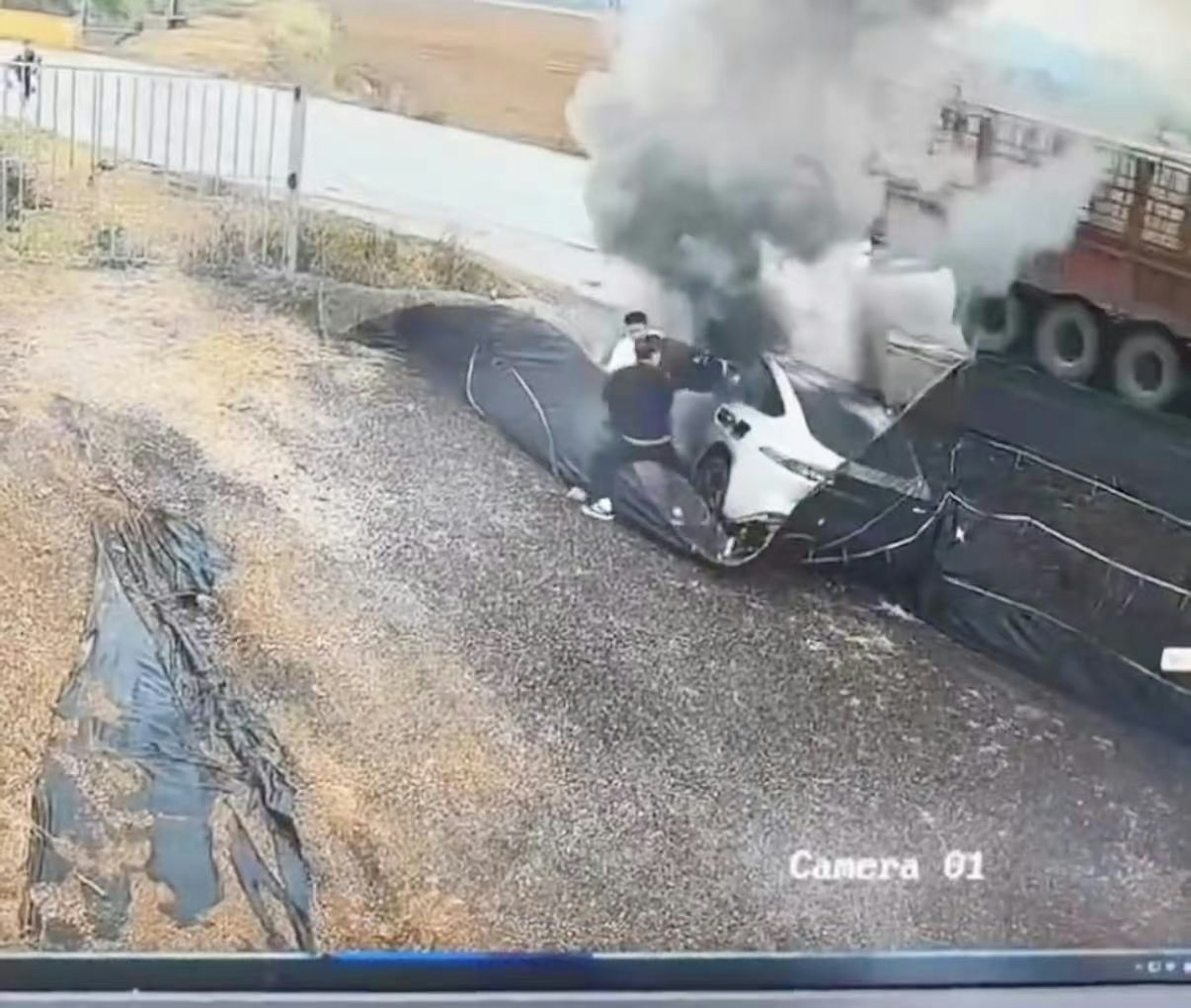 汽車冒煙起火 男子砸窗20秒拽出3名乘客