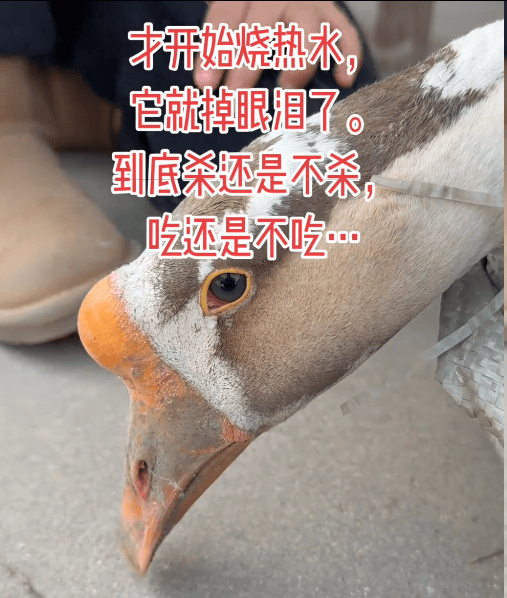 安徽一戶人家,熱水已燒得滾燙,案板靜靜擺在院中,一隻待宰的大鵝卻突然垂首佇立,眼角的淚滴不斷滾落,浸濕了脖頸的羽毛,在地面暈開小小的濕痕。拍攝者隨手記錄下這一幕,配文只有一句樸實的糾結:“到底殺還是不殺”,未曾想,這段短短十幾秒的視頻,一夜之間刷屏全網,數千萬網友集體喊話“求放過”,一場關於生命、共情與人性的討論,在年味漸濃的冬日里,悄然蔓延開來。