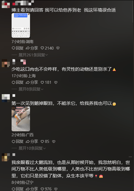 影片發出後,短短幾個小時,播放量就突破了千萬,評論區被密密麻麻的留言淹沒,幾乎清一色的都是“別殺牠”“求放過這隻鵝”“萬物有靈,放它一條生路”。有網友留言說,看到大鵝落淚的那一刻,瞬間就破防了,彷彿看到了一個無助的孩子,在絕望中祈求憐憫,那種眼神,讓人無論如何都狠不下心。還有網友主動提出,願意收養這隻大鵝,給它一個安穩的家,不讓它再面臨被宰殺的命運,甚至有人主動詢問地址,想要驅車前往,只為救下這隻「會流淚的鵝」。