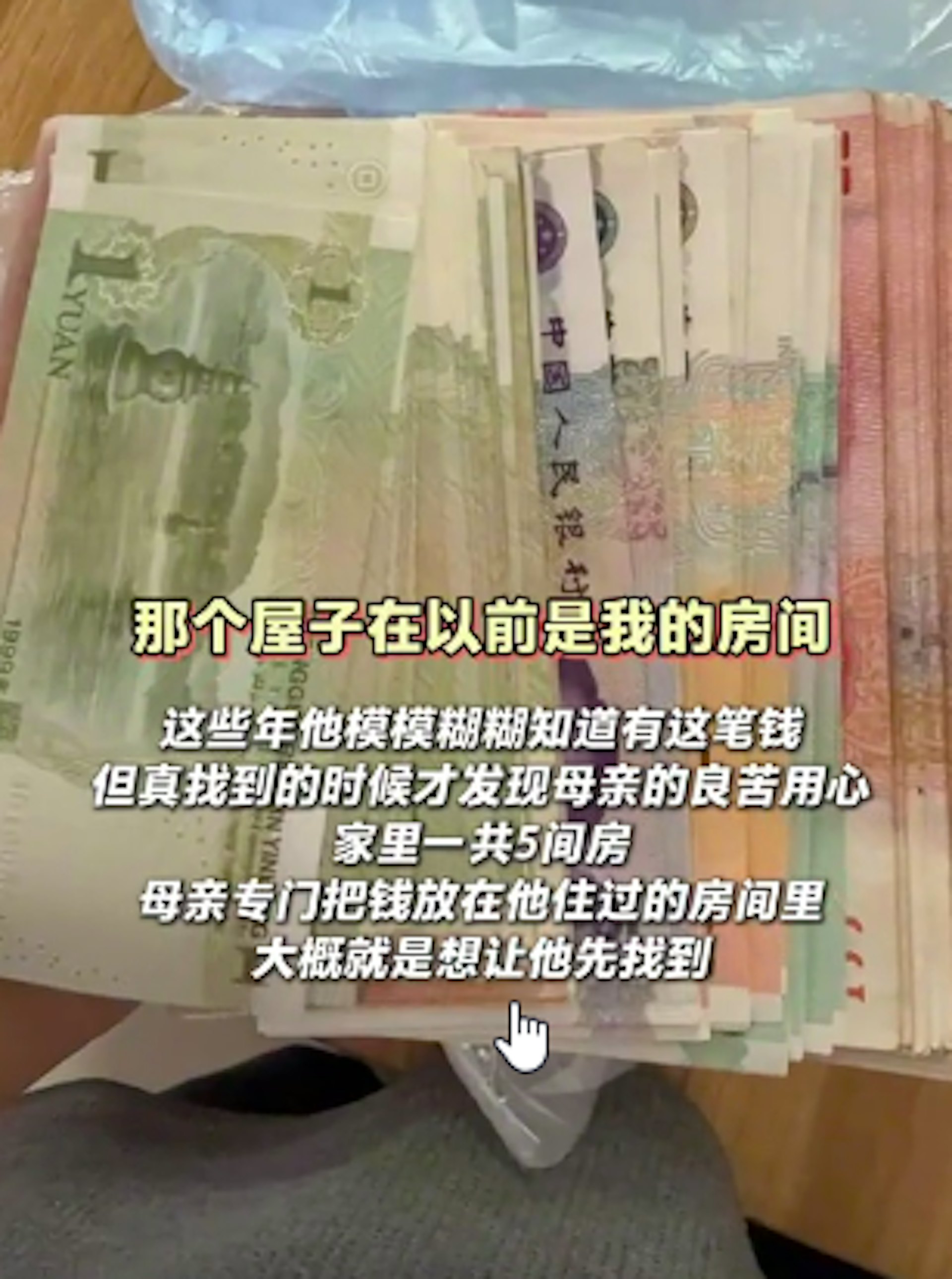 這些年他模模糊糊知道有這筆錢,但真找到的時候才發現母親的良苦用心。家裏一共5間房,母親專門把錢放在他住過的房間裏,大概就是想讓他先找到。(羊城晚報)