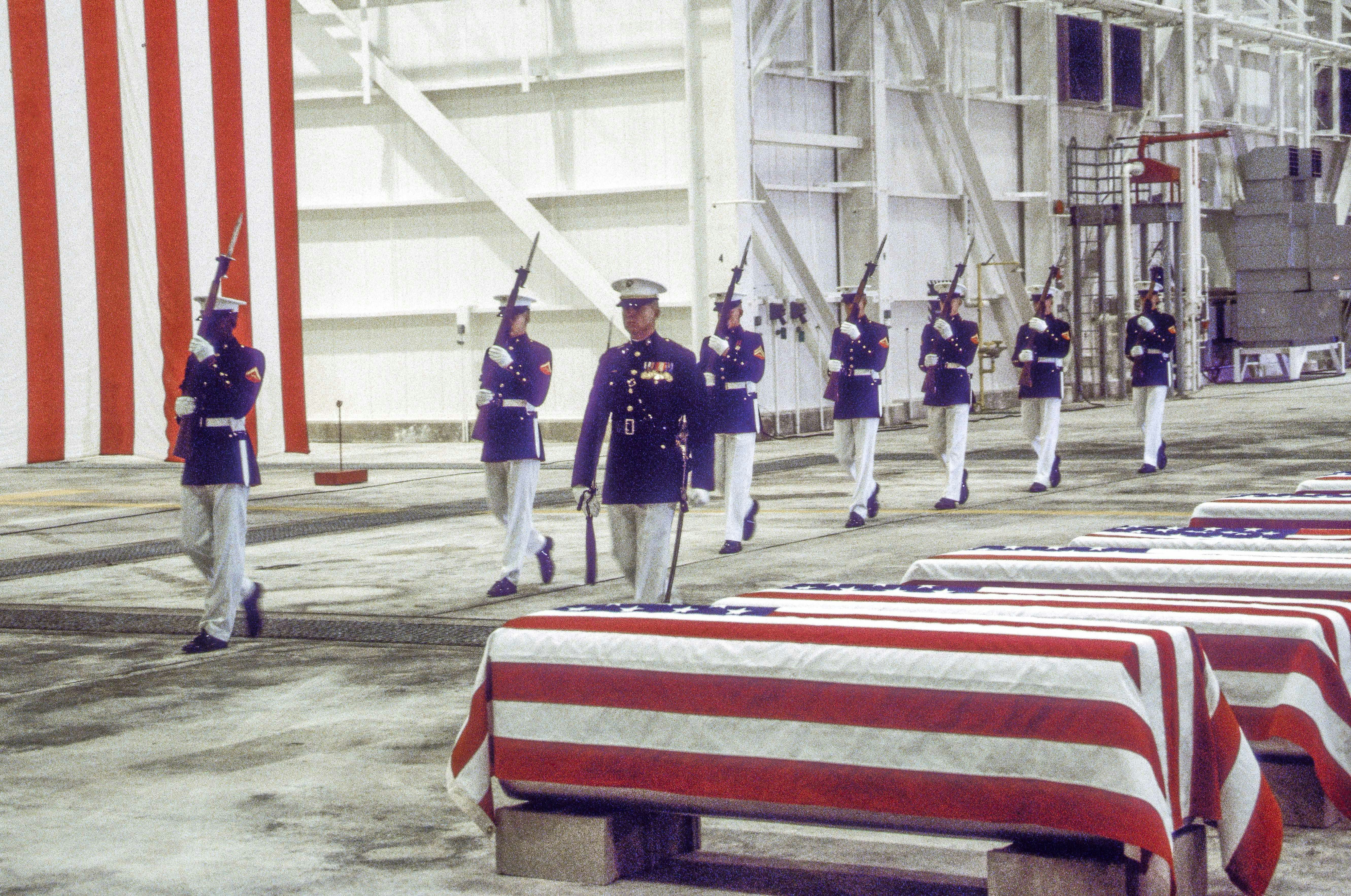 , c3 M# G% i: c6 M, y1983年10月,美國本土首次舉行悼念在貝魯特爆炸案和格林納達入侵中陣亡的軍人的儀式。(Getty)公仔箱論壇* S6 k3 U1 f: O6 i; O