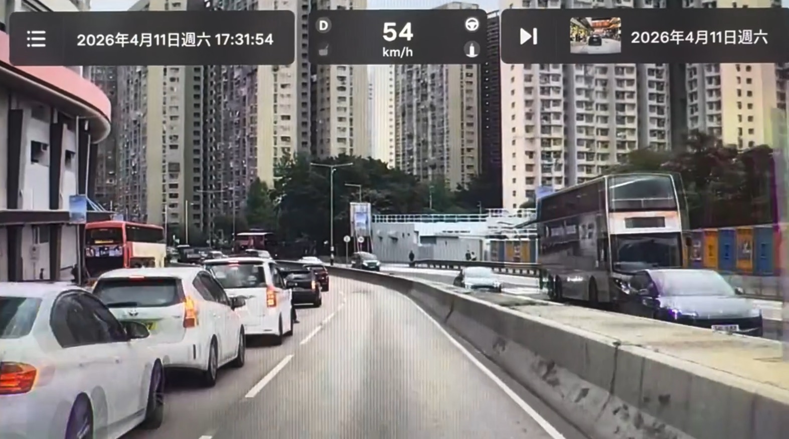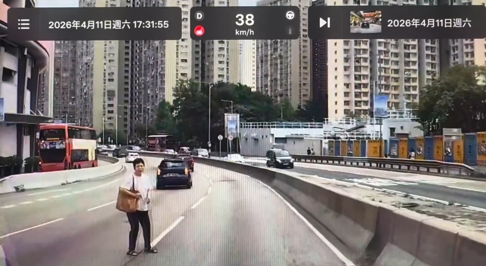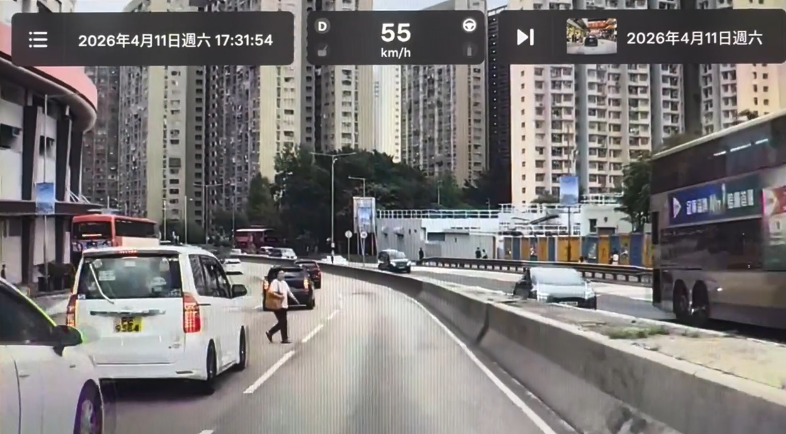 車Cam顯示昨日(11日)下午約5時31分,涉事私家車正沿黃大仙龍翔道往觀塘方向的快線行駛,車速約為每小時54公里,左方中線正處於塞車狀態。然後一名右手挽著袋的中年女子,突然從左邊中線「捐車罅」步出,企圖橫越快線。
