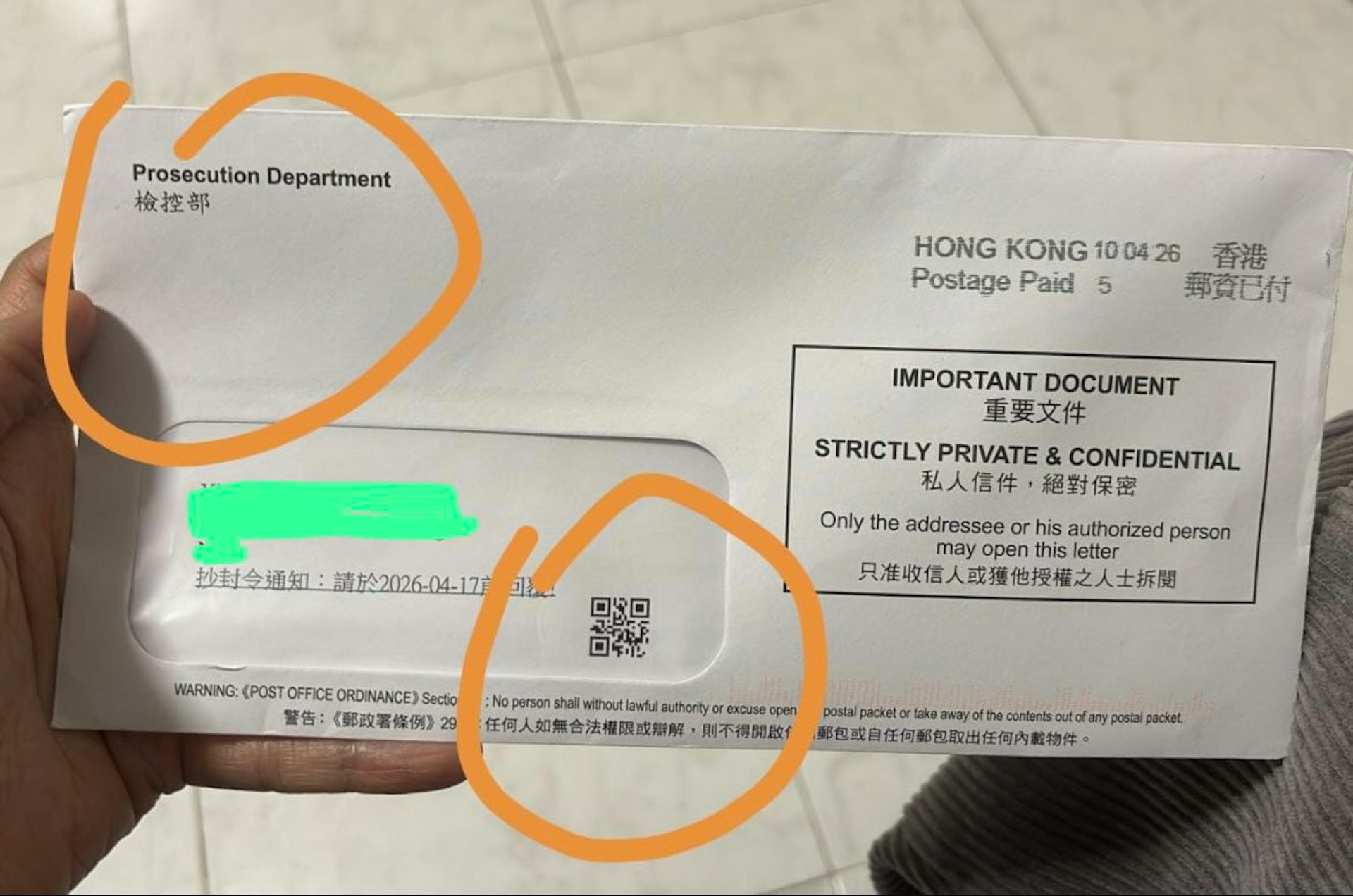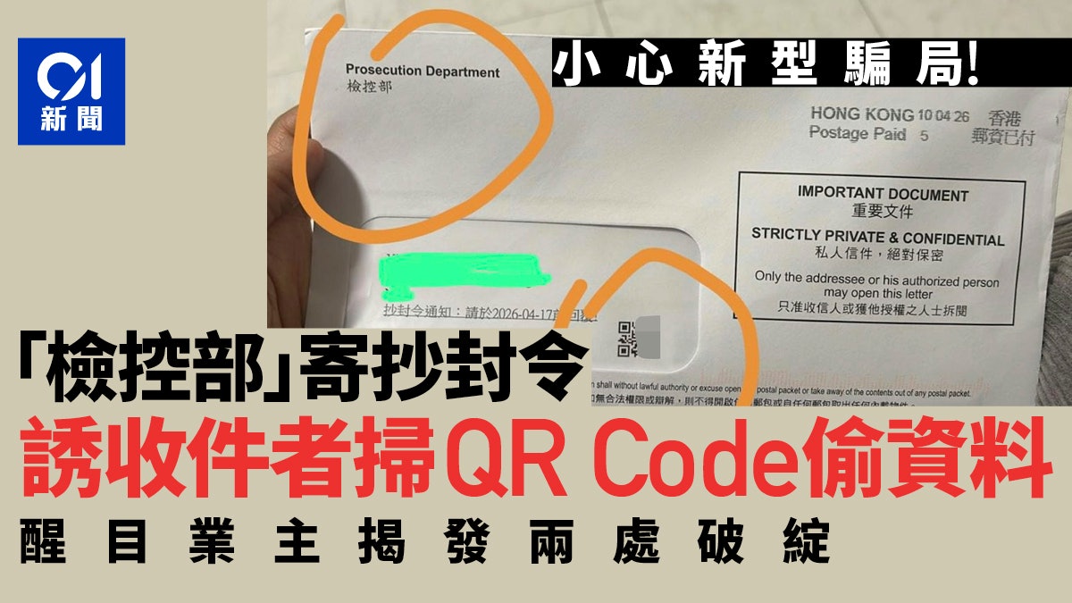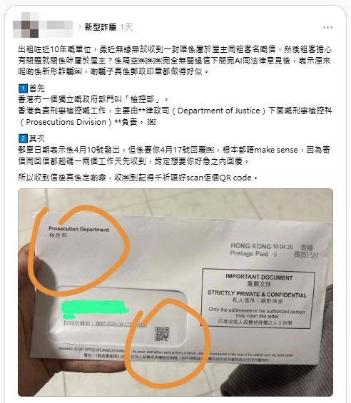 有網民分享,出租近10年的單位,最近收到一封不屬於屋主或租客名的信,信件外觀疑似政府公函,但仔細觀察可見是冒充法律部門、偽造郵政印章,誘使收件者掃QR Code點擊連結,繼而墮入詐騙的圈套。) r; P9 t3 x+ x; o8 m