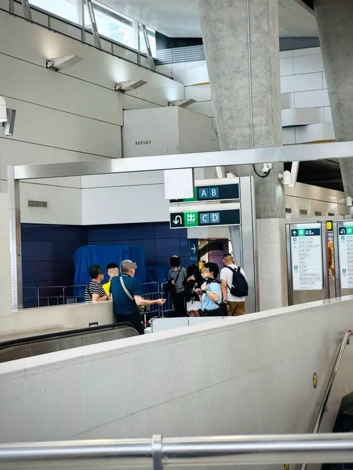 . ?: Q8 v! N- J) A8 y相片見到,1名老伯及1名老婆婆站在港鐵東涌站往A、B出口扶手電梯旁邊,同場還有1名港鐵職員和1名警員,似乎正在處理事情。