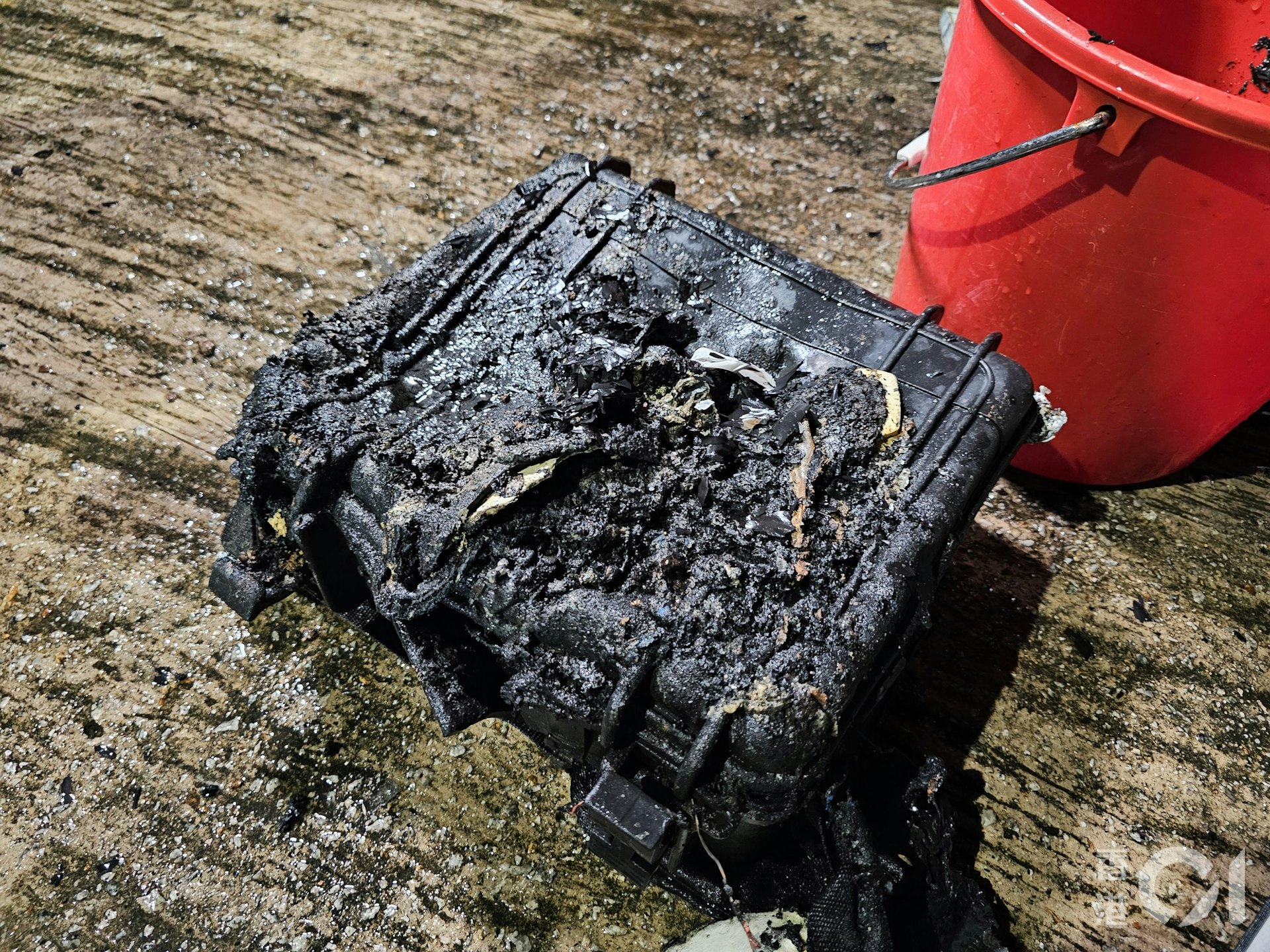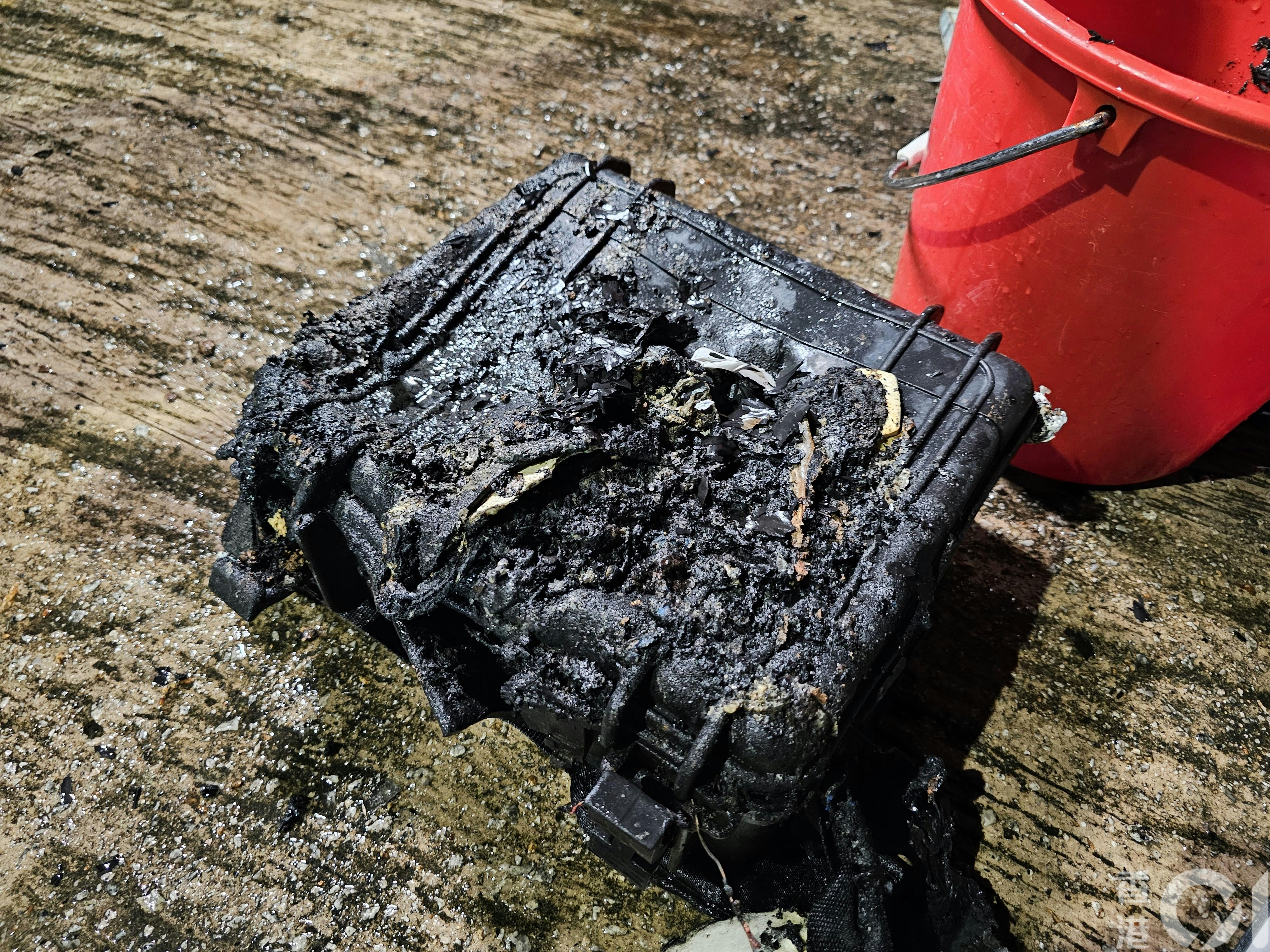 9 b) G0 ~2 R; U6 U& e" a1 {8 s& B4 }一個大型外置充電器嚴重焚毀,部份外殼熔化。(梁偉權攝)