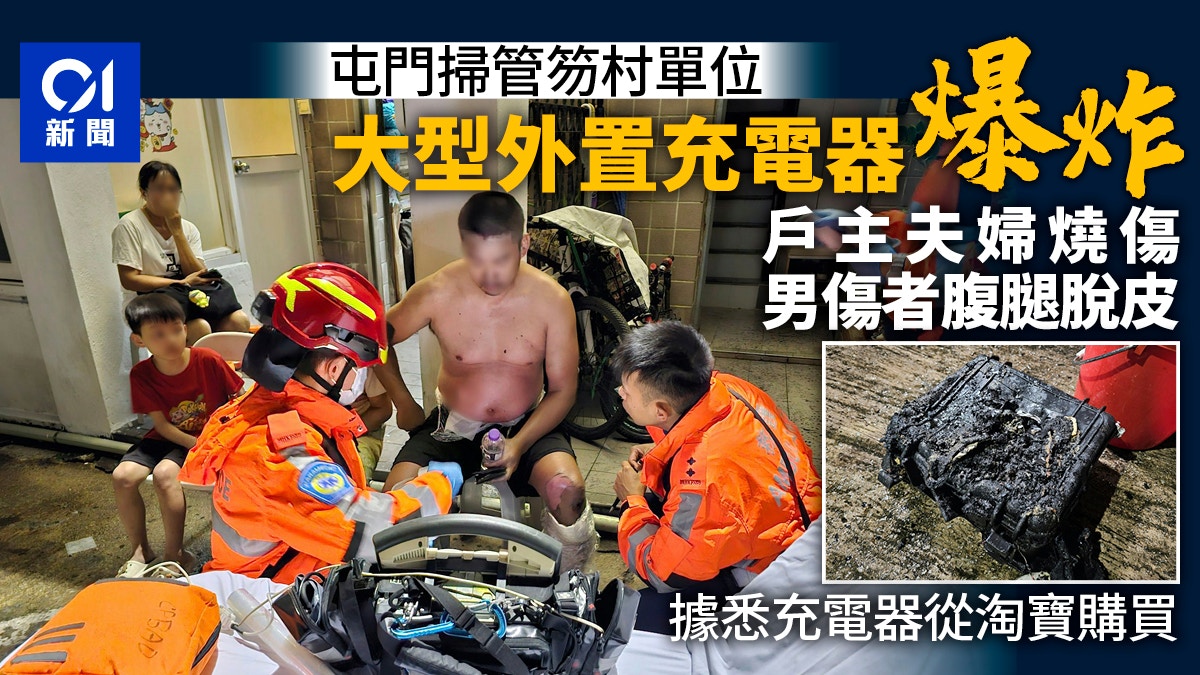 現場可見,男戶主的腹部及雙腿均有燒傷脫皮,需要包上敷料;一個大型外置充電器嚴重焚毀,部份外殼熔化。消息指,男戶主從事裝修行業,涉事充電器於淘寶購買,用於露營燈,原本放於露台,已經完成充電並拔去電源;惟後來冒煙,戶主夫婦見狀立即搬出花園,詎料發生爆炸,兩人嘗試撲火無果,亦被燒傷。