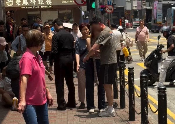 % |+ R6 n8 S X* G5.39.217.77:8898灰衣男左後腦披血,與女伴站於欄杆旁;黑衣男則半跪與坐地白衣男交談。(Threads@wkmik影片截圖)