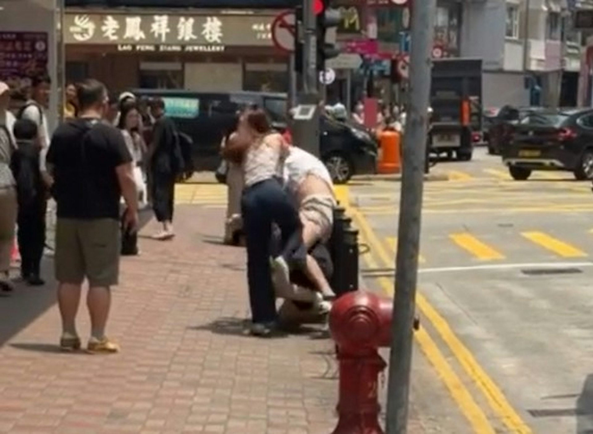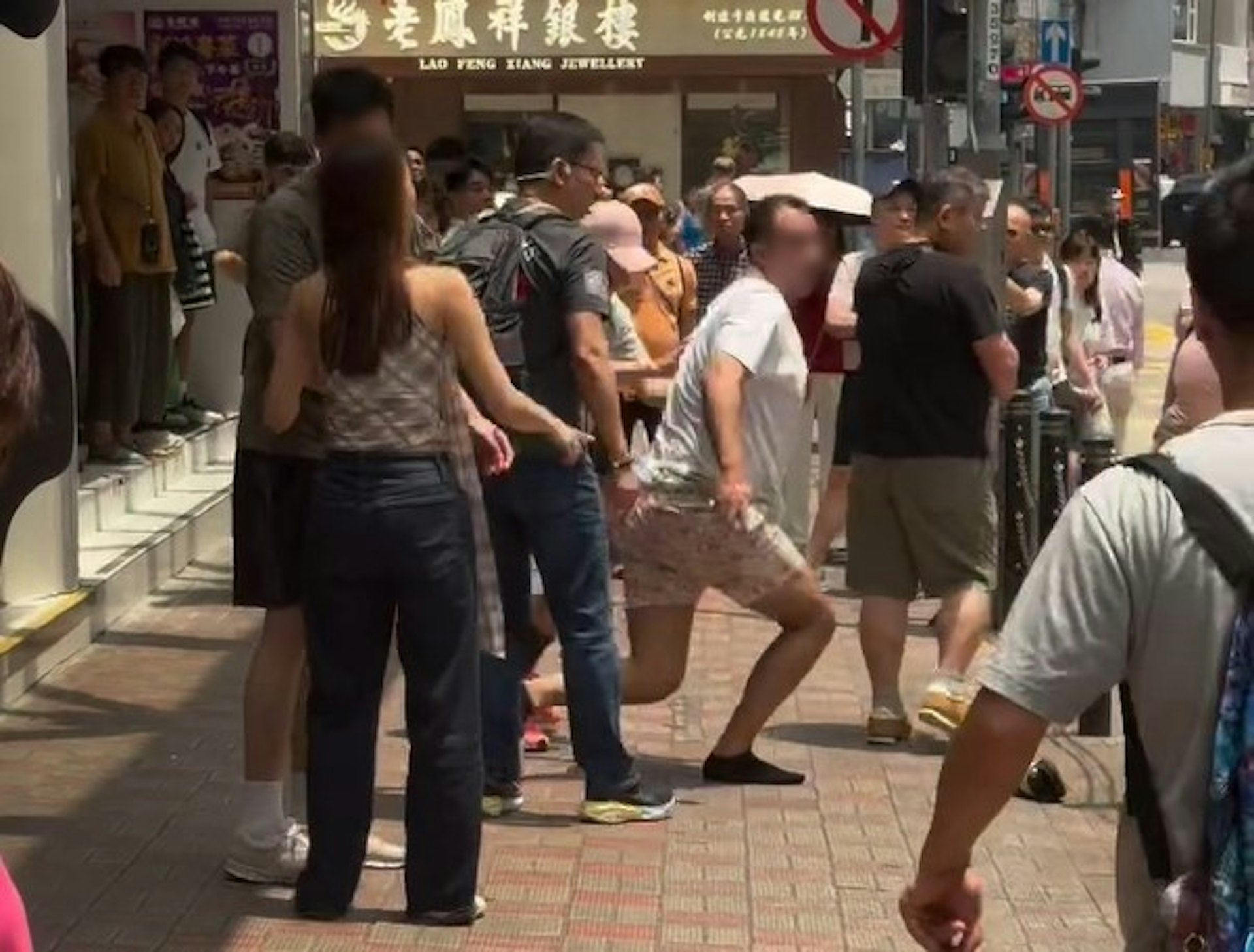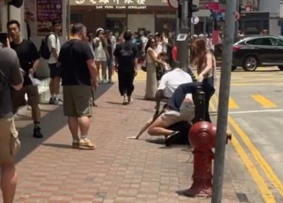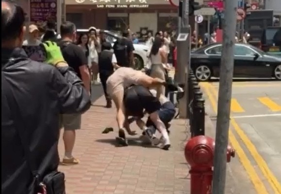 網上影片可見,現場為在銅鑼灣廣場二期對開行人路。涉案兩男大打出手,粗口橫飛,白衫男手持黑色棍狀物,一度騎住灰衣男,兩人扭作一團倒地。與灰衣男同行的長髮露肩女伴見狀,跨越欄杆鐵鏈「救駕」,慌忙扯住白衣男制止,惜亦被推倒。