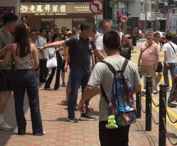 與灰衣男同行的長髮露肩女伴,跨越欄杆鐵鏈上前扯住白衣男阻止。(Threads / wkmik 影片截圖)tvb now,tvbnow,bttvb: `& b v ^1 g( W