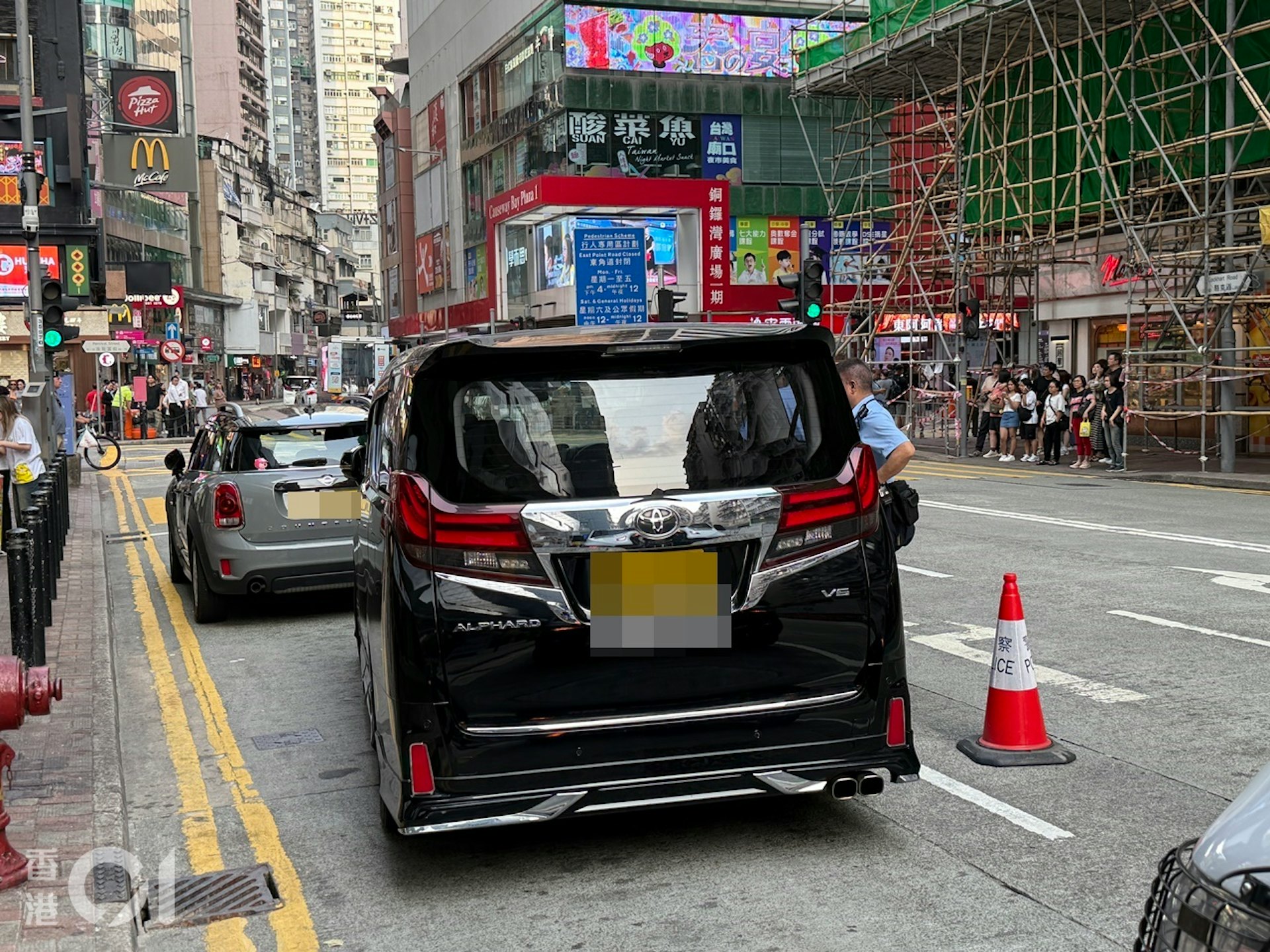 警方以雪糕筒圍繞涉事私家車及七人車調查。(羅日昇攝)