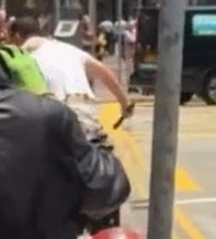 6 ^4 j& S3 P* x+ F$ p餘勢未止,白衣男再從後手腳並用箝制灰衣男,兩名分別頭戴鴨舌帽及身穿黑色西裝的男途人見義勇為,前者扯開白衣男不果,後者跑至施援,終一同奪走並拋開棍狀物。局勢扭轉後,灰衣男與女伴一度出手反擊,白衣男大叫4次「仲嚟!」其拖鞋在混亂中飛脫。