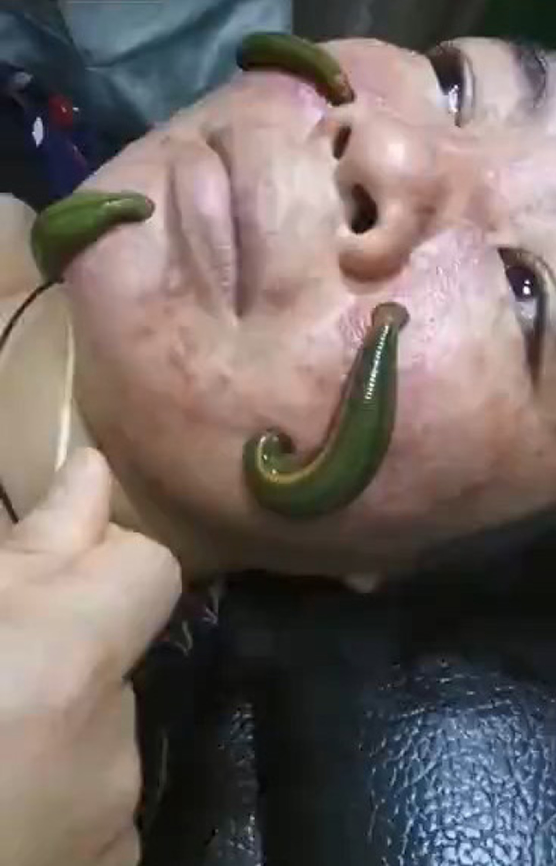 " a! D% a8 y3 p: u2018年微博曾瘋傳一條影片,顯示有美容師將水蛭放到中年女子臉上,聲稱可去痘除疤。(微博影片截圖)