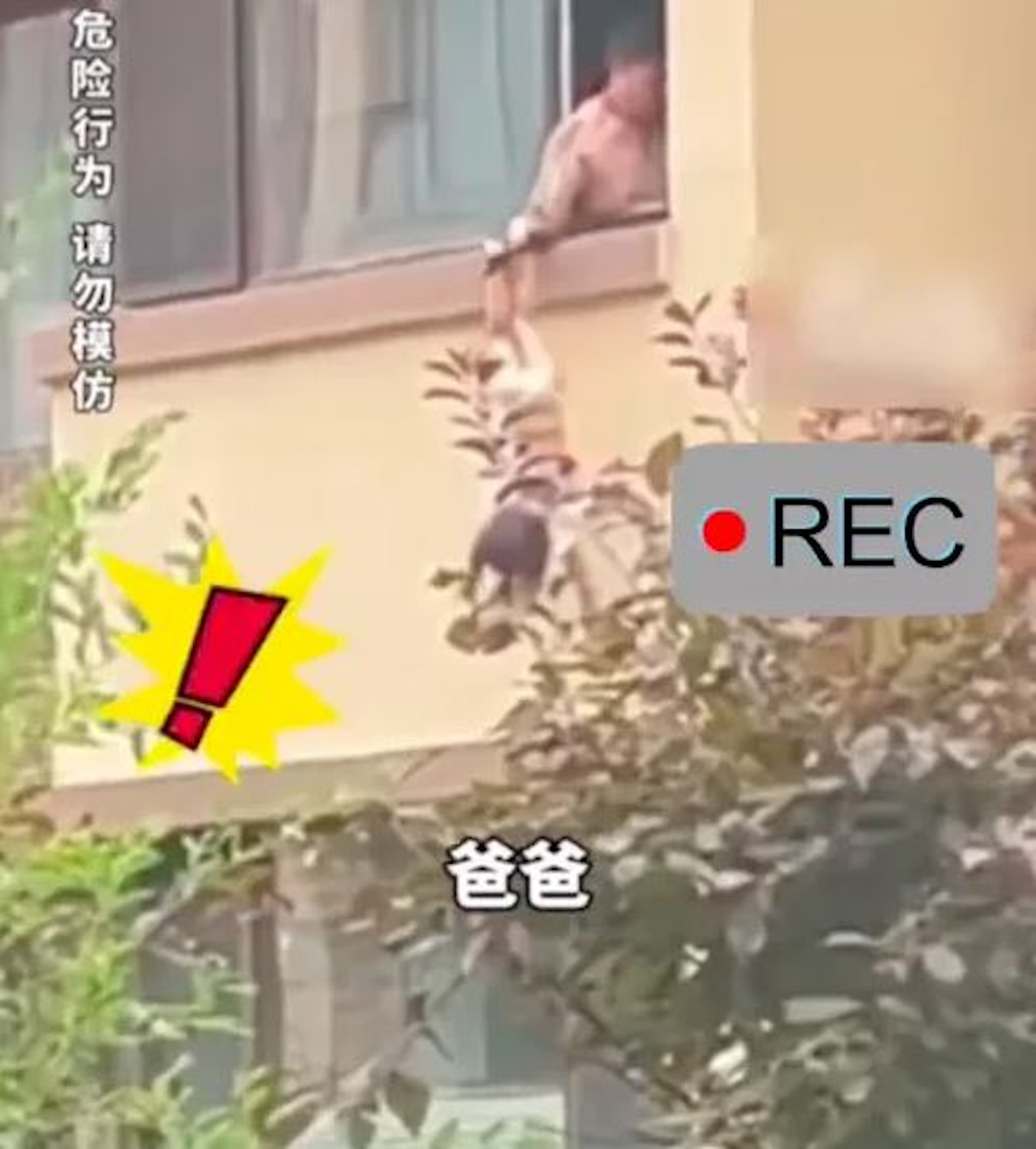 # h+ X( U& Q$ w+ m0 ^& v9 w/ M據網民發布的片段顯示,該名父親拎著女兒的腳脖倒掛其於窗外訓斥,期間女童大聲哭嚎,明顯受驚,場面令人心酸。然而,面對女兒的哀叫,男子非但沒有心軟,反而大吼「不要吵」。