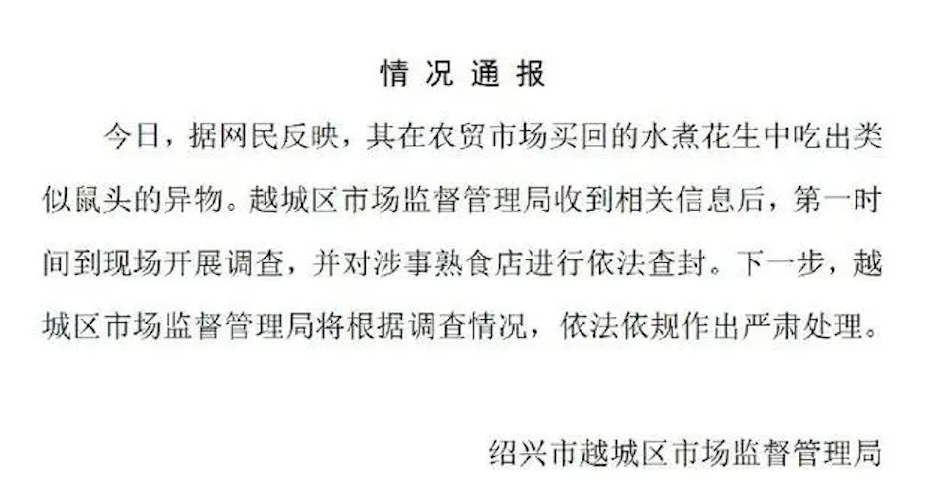 對此,紹興越城區市場監管局周五(28日)發布情況通報指,據網民反映,其在農貿市場買回的水煮花生中吃出類似鼠頭的異物。越城區市場監督管理局第一時間到現場開展調查,並對涉事熟食店進行依法查封。下一步,將根據調查情況,依法依規作出嚴肅處理。 |