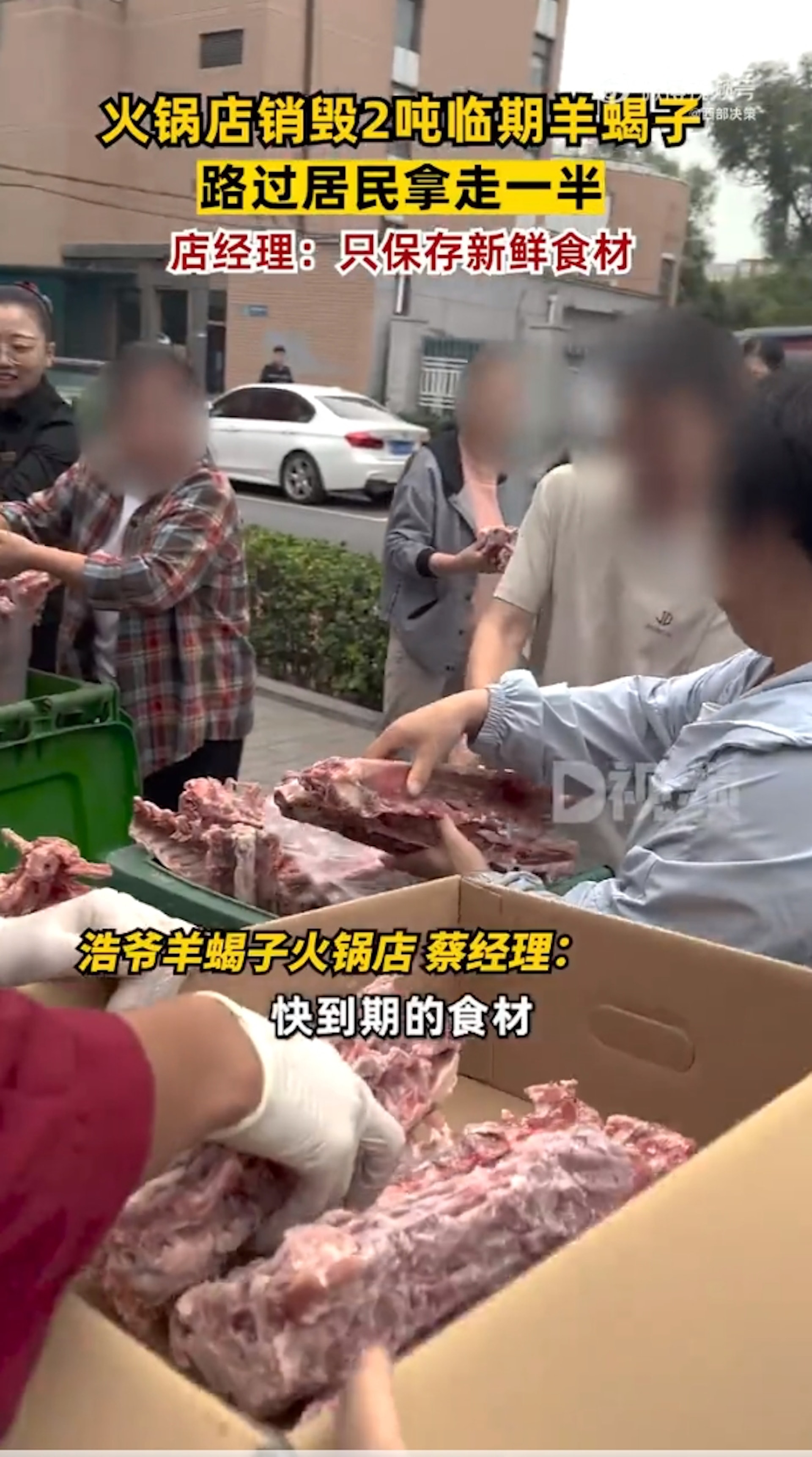 網傳影片中,火鍋店門口來了一輛垃圾車,一旁還有一群人不分男女老少,不停伸手往綠色大型垃圾桶撈,看到成色不錯的羊蠍子,隨即往塑膠袋裡裝,店員還好心地協助拆箱。