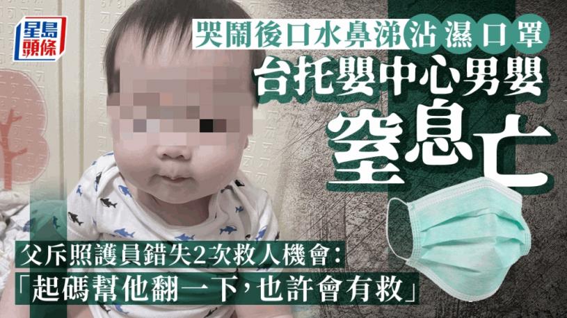 報道指,事發的托嬰中心因近期呼吸道疾病流行要求小朋友必須戴口罩,出事男嬰因為抗拒而將口罩扯掉,但卻又被照護員強行戴回,因此開始哭鬧,眼淚浸濕口罩,口罩因此黏住口鼻,加上趴臥,造成男嬰被活活焗死。/ ?% Y" E& M- Z0 z; v" ^