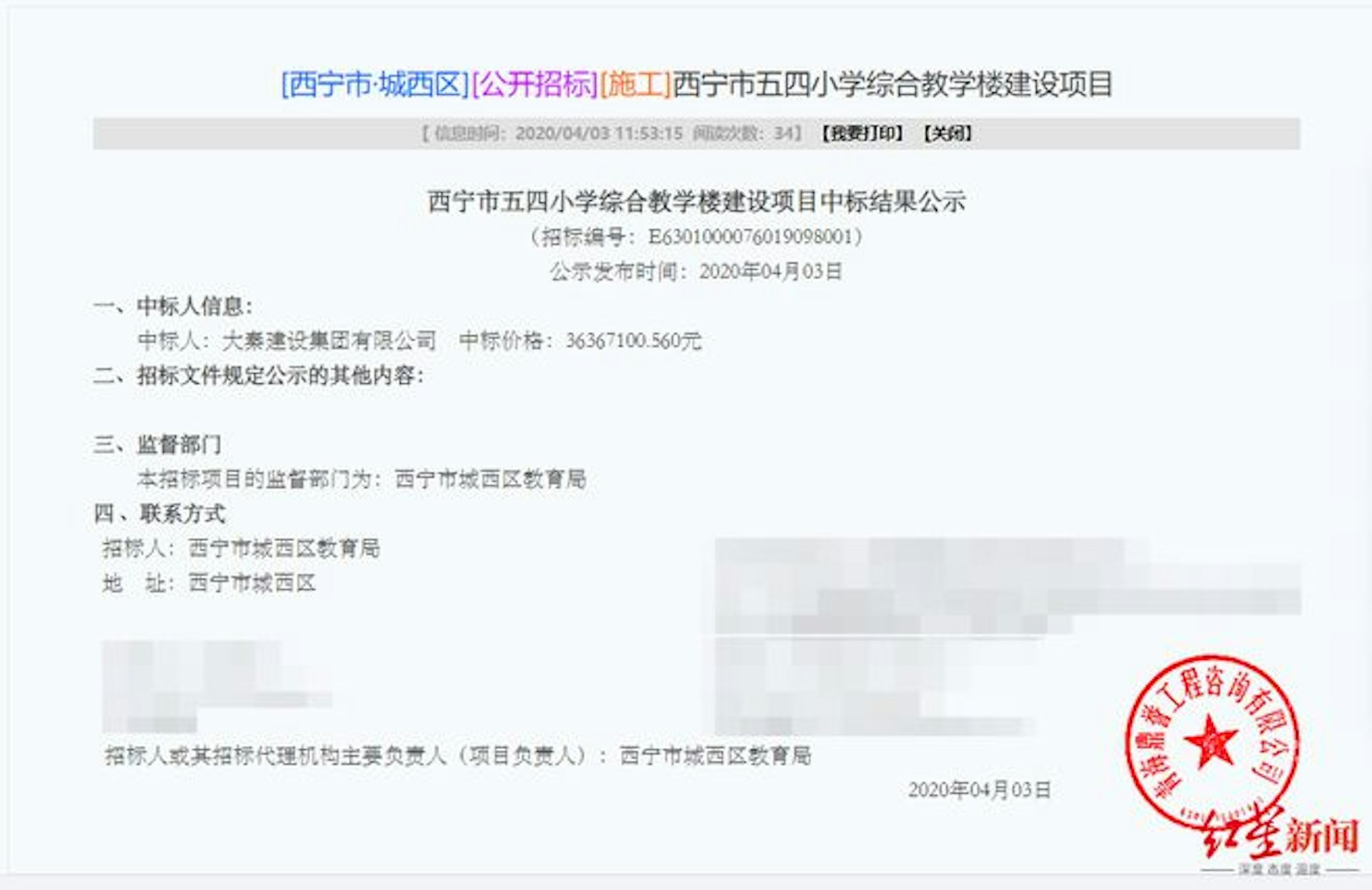 據西寧市公共資源交易網《西寧市五四小學綜合教學樓建設項目施工招標公告》顯示,五四小學綜合樓建設項目建築面積約為8891.21㎡,招標人為西寧市城西區教育局,計劃工期為2020年3月10日至2021年7月10日,共488天,中標價為36367110.560元。公仔箱論壇; h7 K$ m" _% C