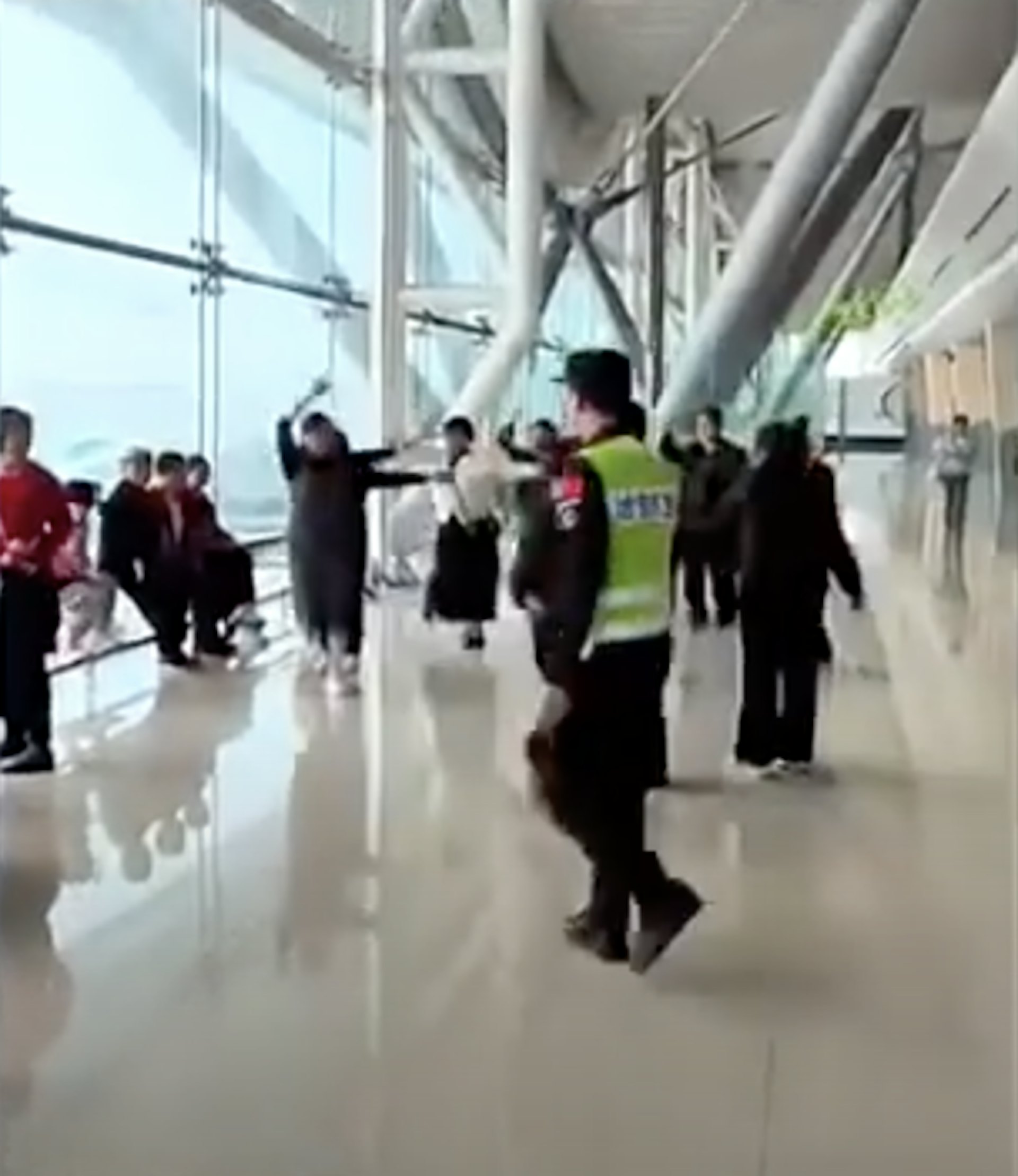 網傳影片可以看到,在登機口前休息區,一群大媽正跟隨音樂節奏跳舞,人數約莫8、9人之多,眾人圍成一圈,場面看起來十分歡樂。