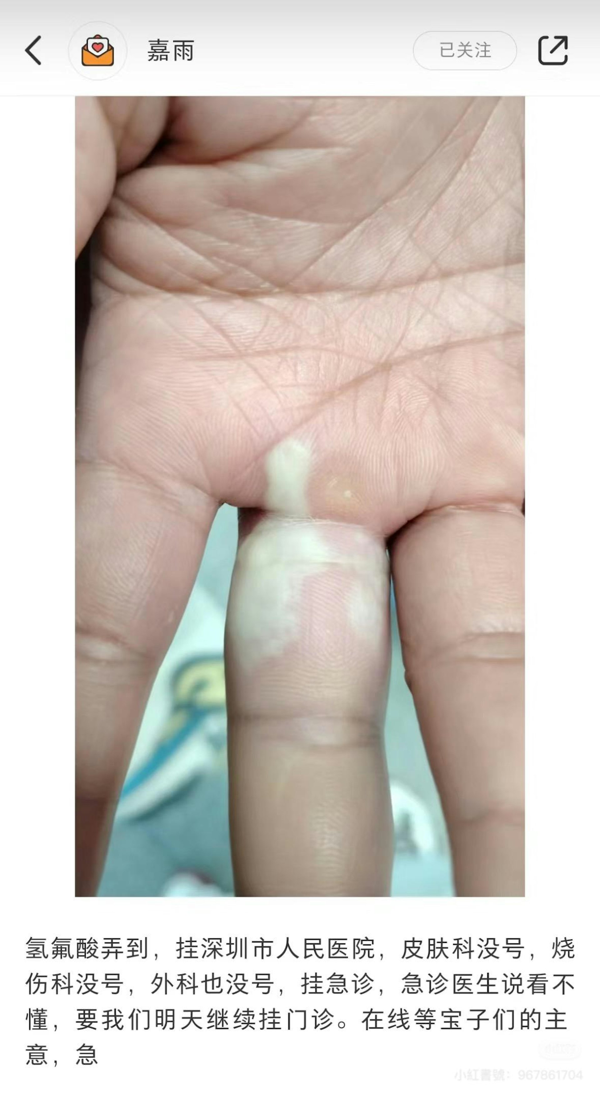 10月9日,當事人在社交平台發文求助稱,自己的手指沾染氫氟酸,在深圳市人民醫院掛號,但「皮膚科沒號,燒傷科沒號,外科也沒號,掛急診,急診醫生說看不懂,要我們明天繼續掛門診」。帖文引起眾多網民關注,並提醒其危險性,應立即就醫。tvb now,tvbnow,bttvb" q& v4 [ t! e4 x. j