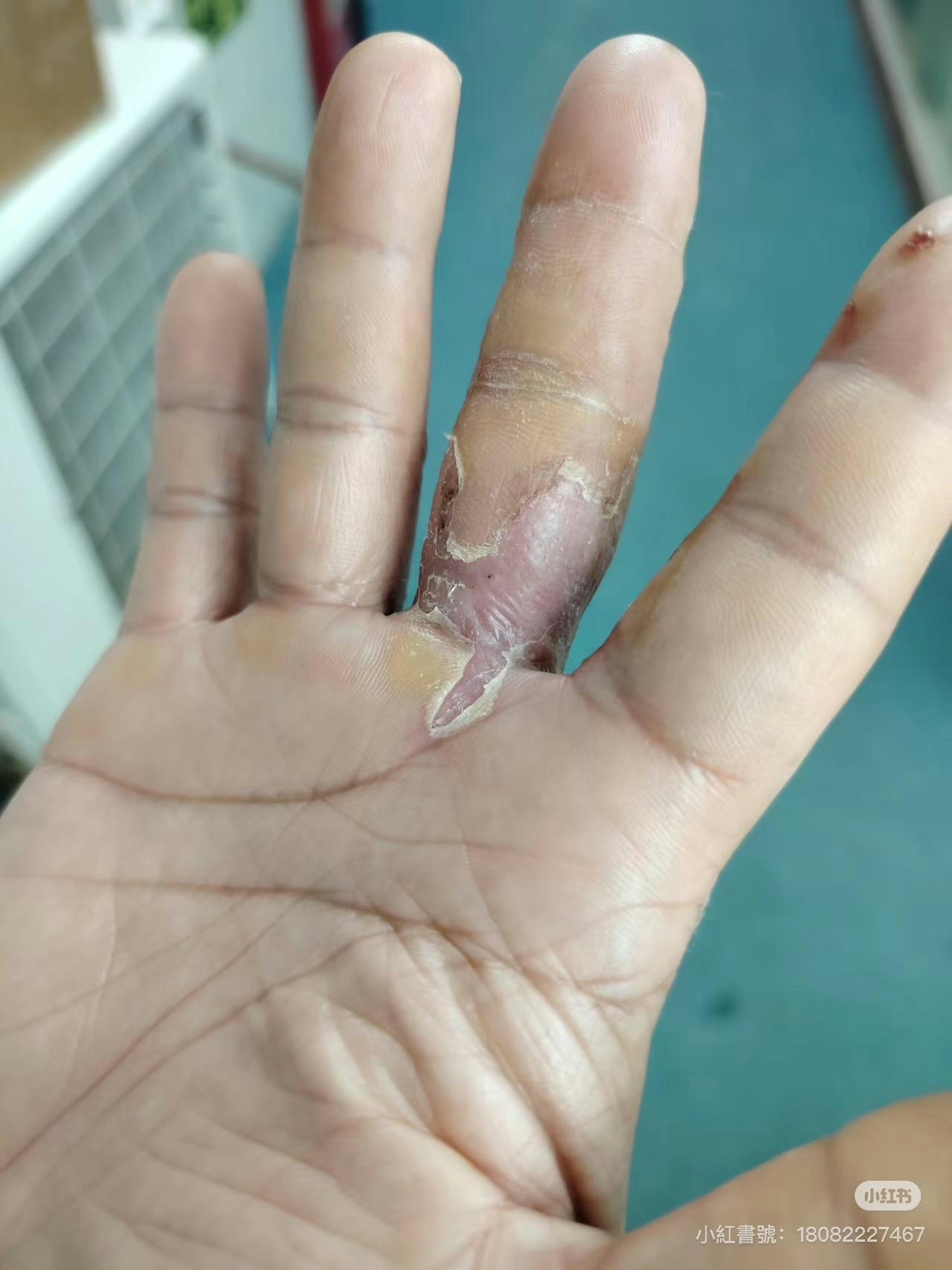 : d' J* G4 b( t( F" c* H10月12日,當事人更新求醫進度,並稱已到深圳市第二人民醫院掛急診燒傷科,配圖顯示其手指的傷情更為嚴重,「醫生說是化學品燒傷,給開了葡萄糖酸鈣,把手指頭燒傷的皮膚全部剔除,手指頭都爛了。然後從手指頭骨頭邊打藥水進去,噴生長因子,抹藥膏包紮。第二天換藥手腫了發炎,打了消炎針。第三天手起泡了,可能包紮太厚不透氣,明天繼續換藥」。