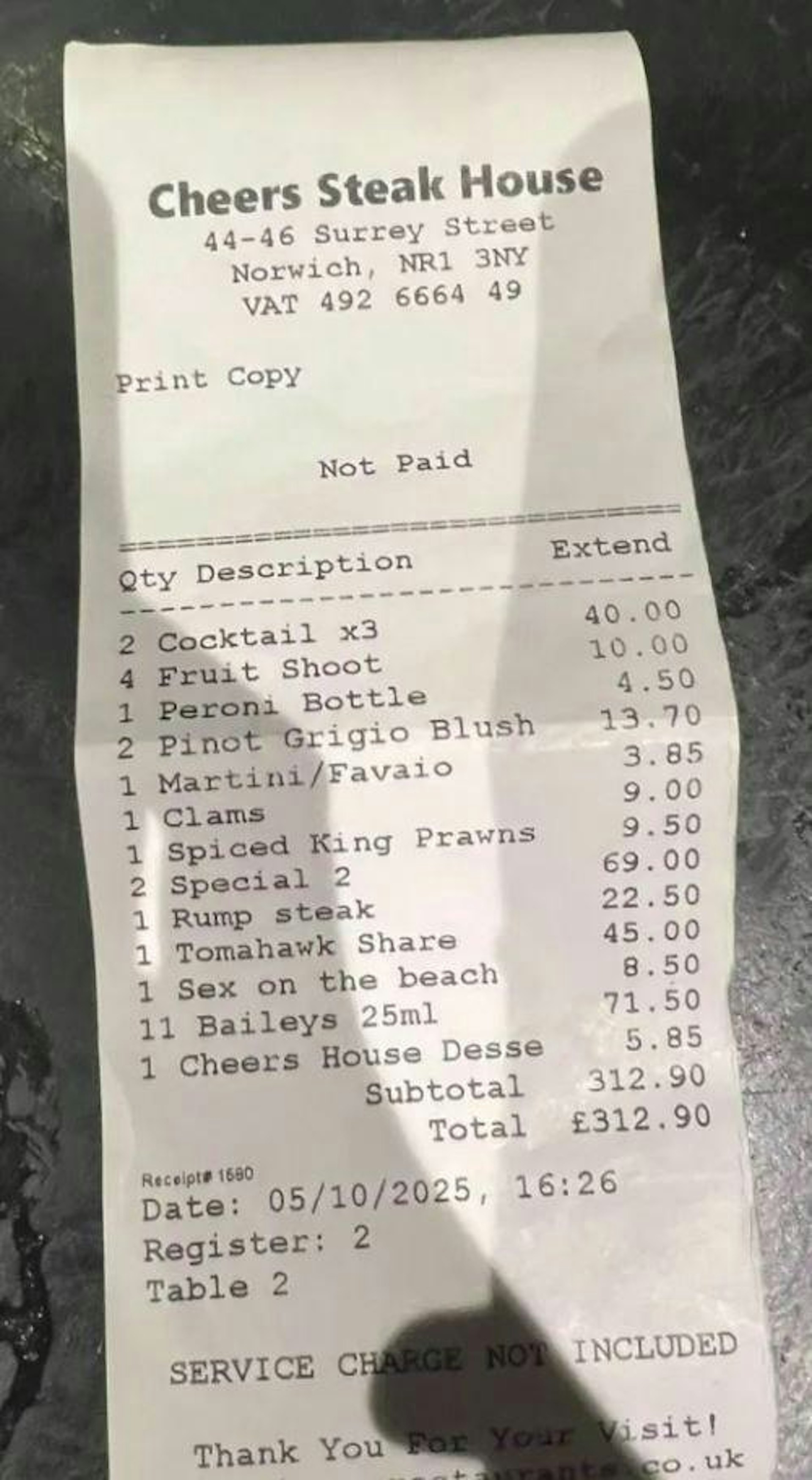 * ~2 J- k9 Z1 V6 K% M1 f; a5 TTVBNOW 含有熱門話題,最新最快電視,軟體,遊戲,電影,動漫及日常生活及興趣交流等資訊。賬單見到,4名女子點了牛排、威士忌百利甜酒等,總值312.9英鎊(約3,200元)。(網上圖片)