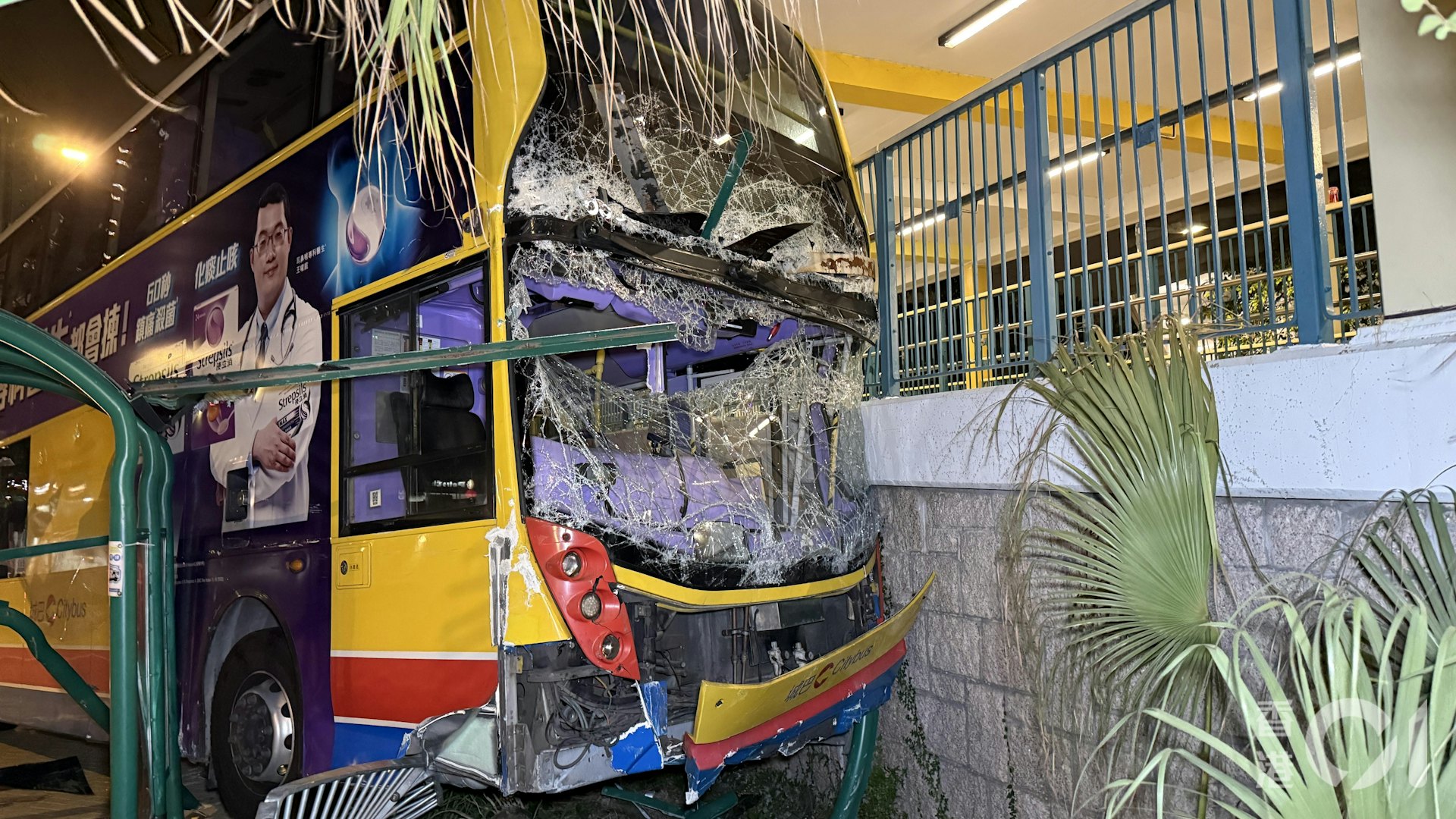 " q" Y9 x" ?' ^4 ~/ @一輛城巴沿東涌松仁路慢線行駛,期間懷疑失控自炒,涉事城巴車頭被撞毀,描風玻璃破碎。(李家傑攝)