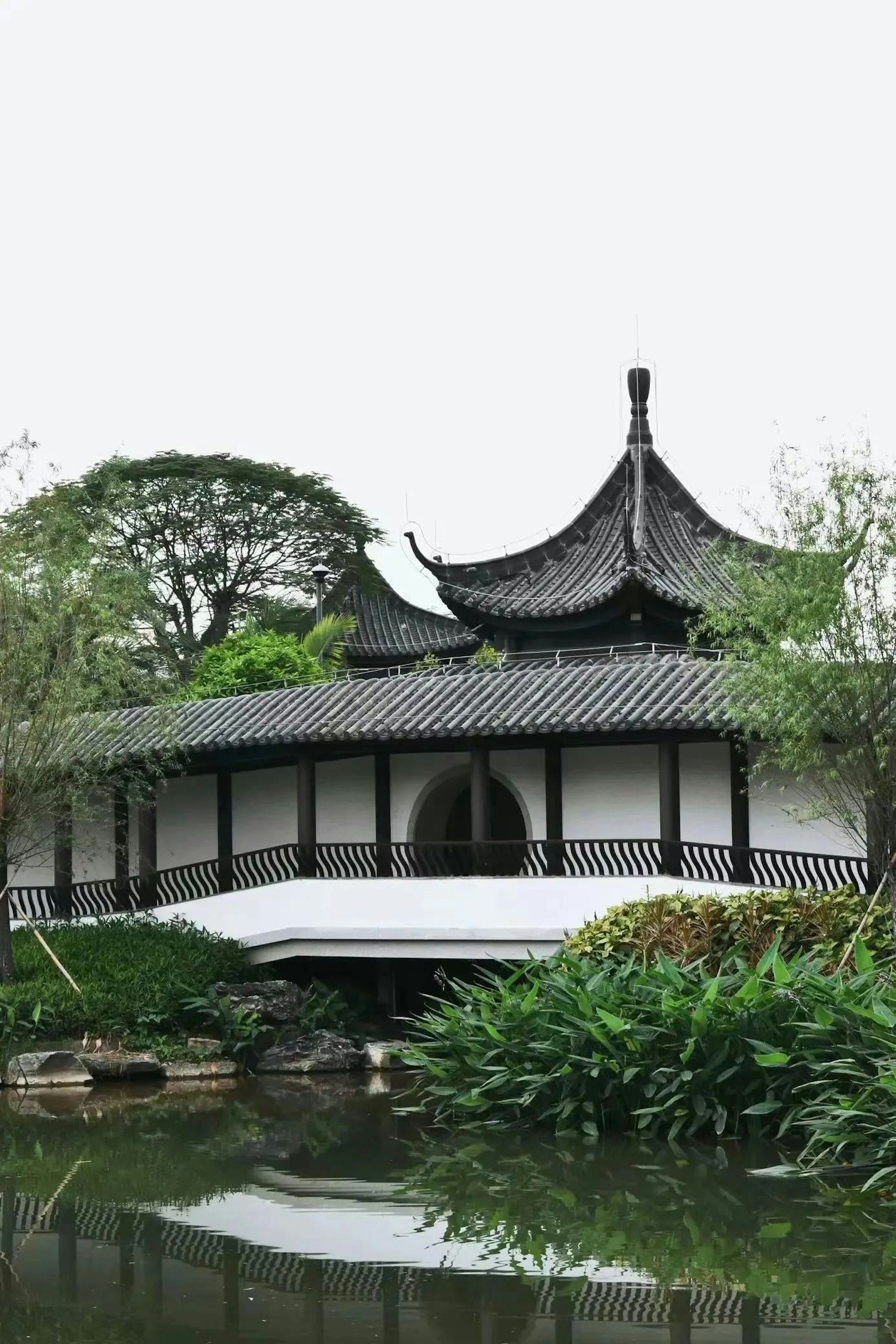 # B I: q, G- m6 X! t從曲藝園向東邊走就能看到庭院和建築共生,一派小橋流水人家的畫面,傍水而建,悠悠然漂浮在湖面,青磚白牆,淡雅更不失巧雅,從河對岸看過去像一幅嶺南派的水墨畫一般。