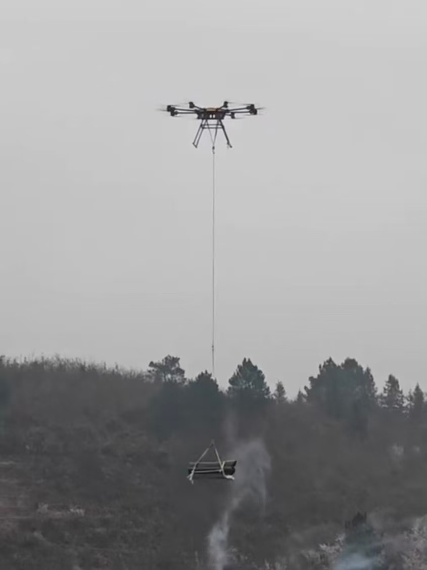 無人機吊著一副棺材飛往山頂墓地。(影片截圖)5.39.217.77:8898% \2 e2 l$ I7 ~* A