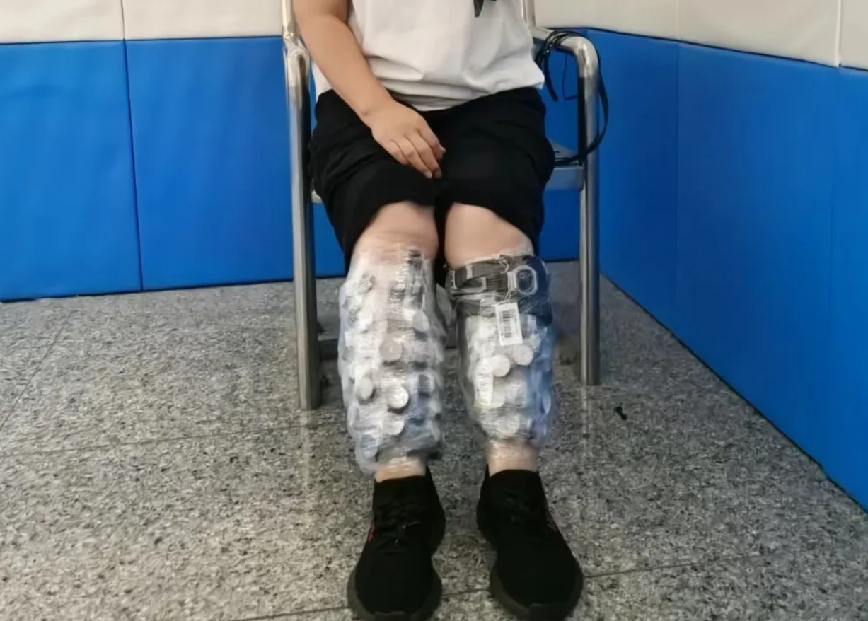 近日皇崗海關在福田口岸旅檢進境(由香港進入內地)渠道查獲一宗旅客小腿綁藏73隻手錶進境案。(中國海關總署微信公眾號)