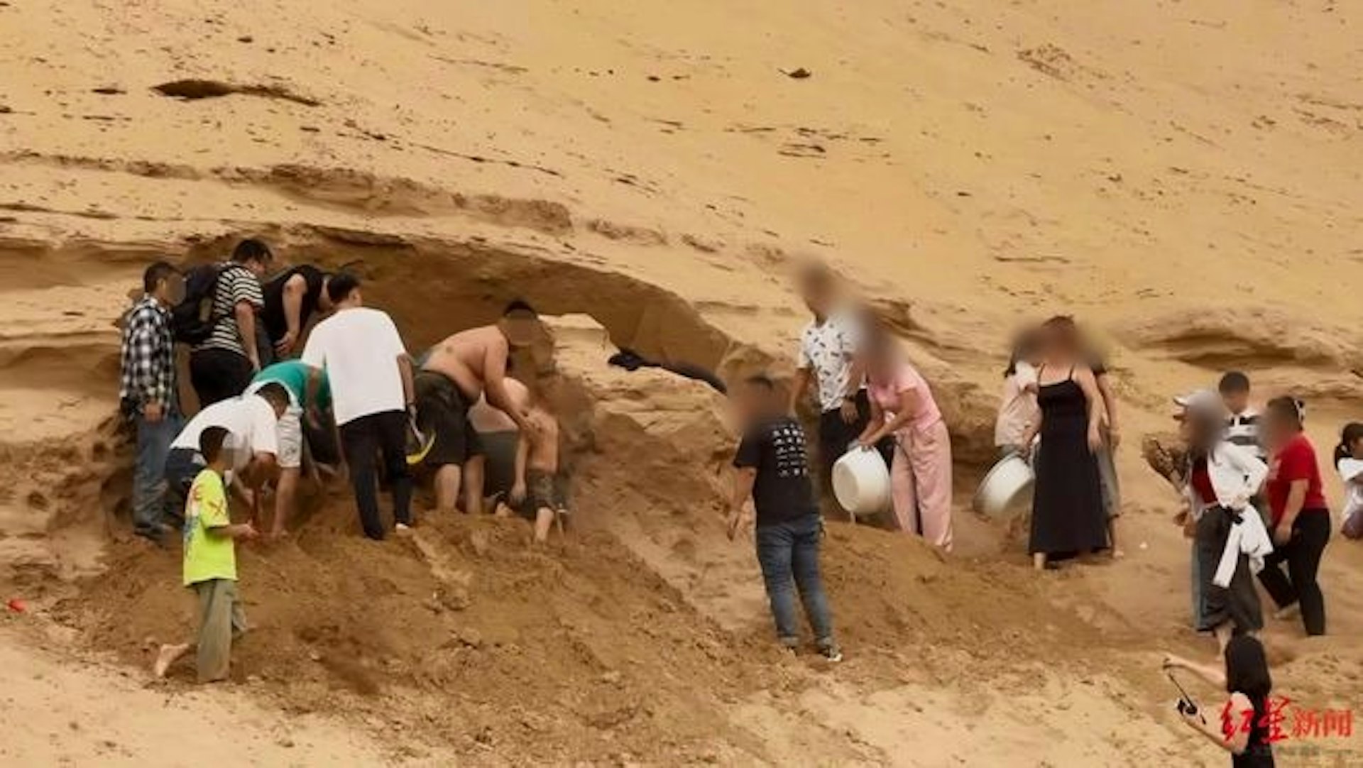10餘名遊客徒手刨沙救人。(紅星新聞)