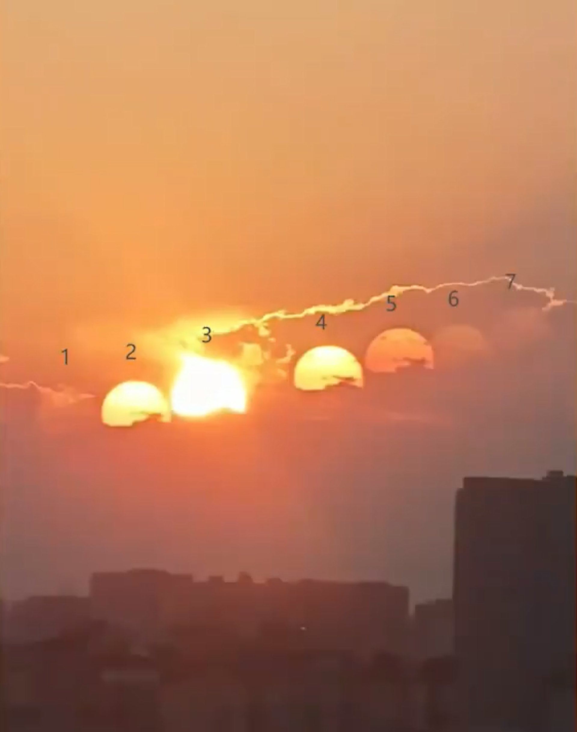 , T: m5 B6 p1 J/ W! N成都市民拍下7個太陽同框的影片,引發熱議。(影片截圖)