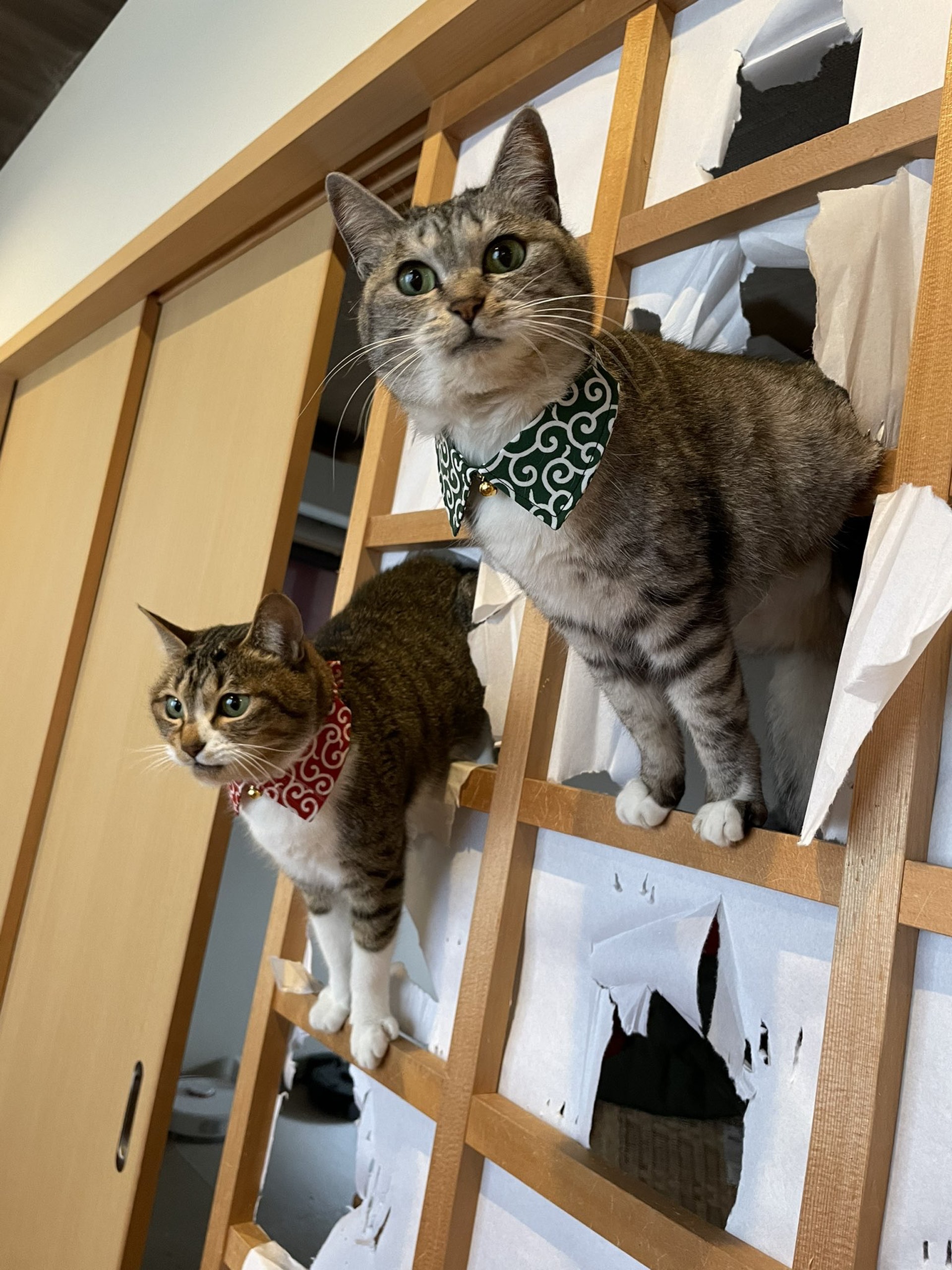 怎麼驚恐成這樣!日本住家的常裝有日式紙門,紙門上的和室紙雖較一般紙張厚,但用力戳仍容易被弄壞,日本推主就直擊了事故現場,家中貓貓直接闖破和室紙,後方的另一隻貓回頭發現飼主後面露驚恐,彷彿在澄清「看清楚啊!不是我弄的欸!!」