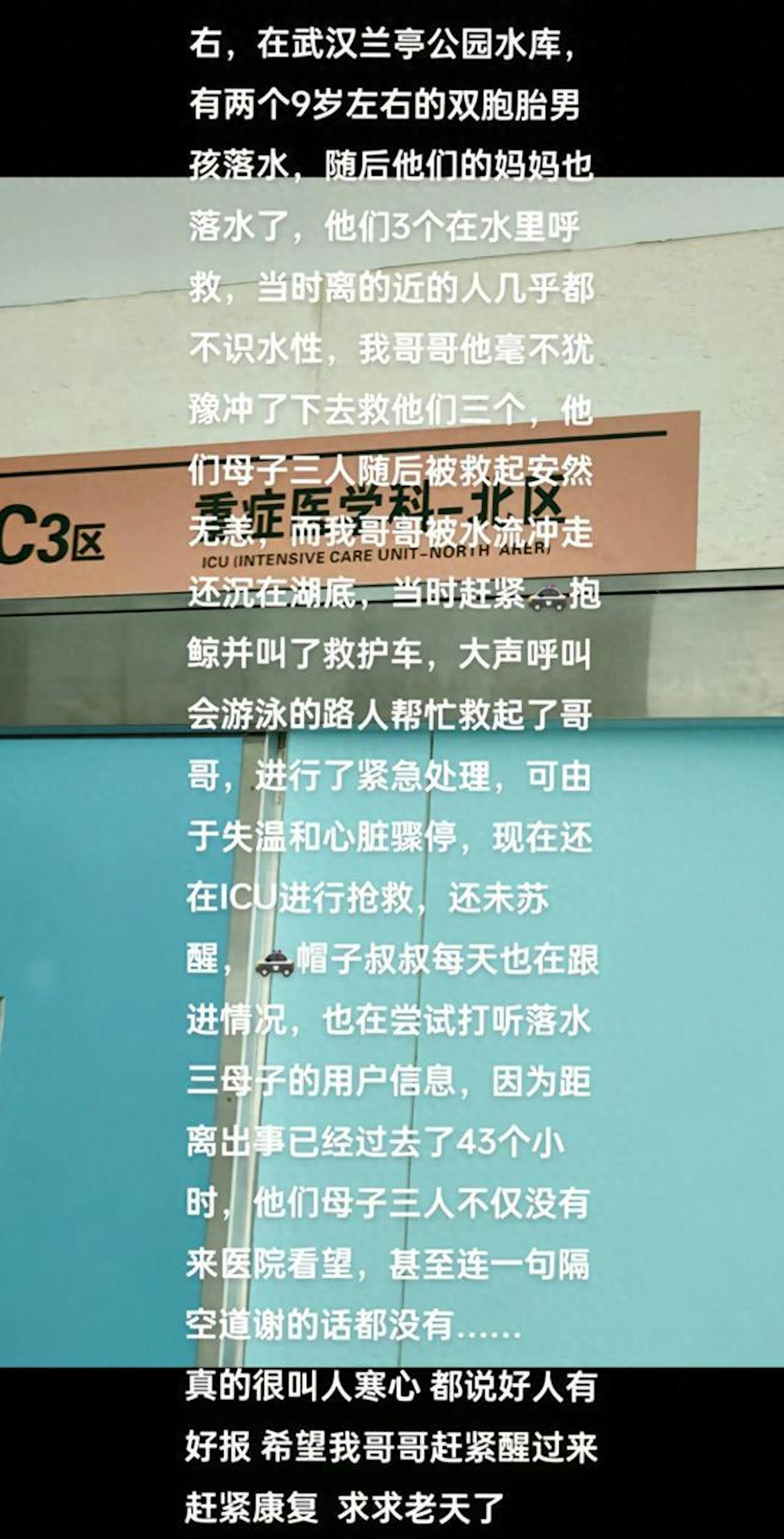 湖北一名女子近日發影片稱,7月14日下午,一對雙胞胎和他們的母親在武漢一個水庫落水,其哥哥毫不猶豫跳進水中救人,最終,母子三人獲救,哥哥則被水沖走,被路人救起後送到ICU搶救,昏迷至今。然而,母子三人被救後卻從未露面,「我們沒有想過要他們回報什麽的,就是覺得很寒心」。事件引起輿論關注,有網民甚至慨嘆,「舍命救人要謹慎,因為你有可能救的並不是人」。