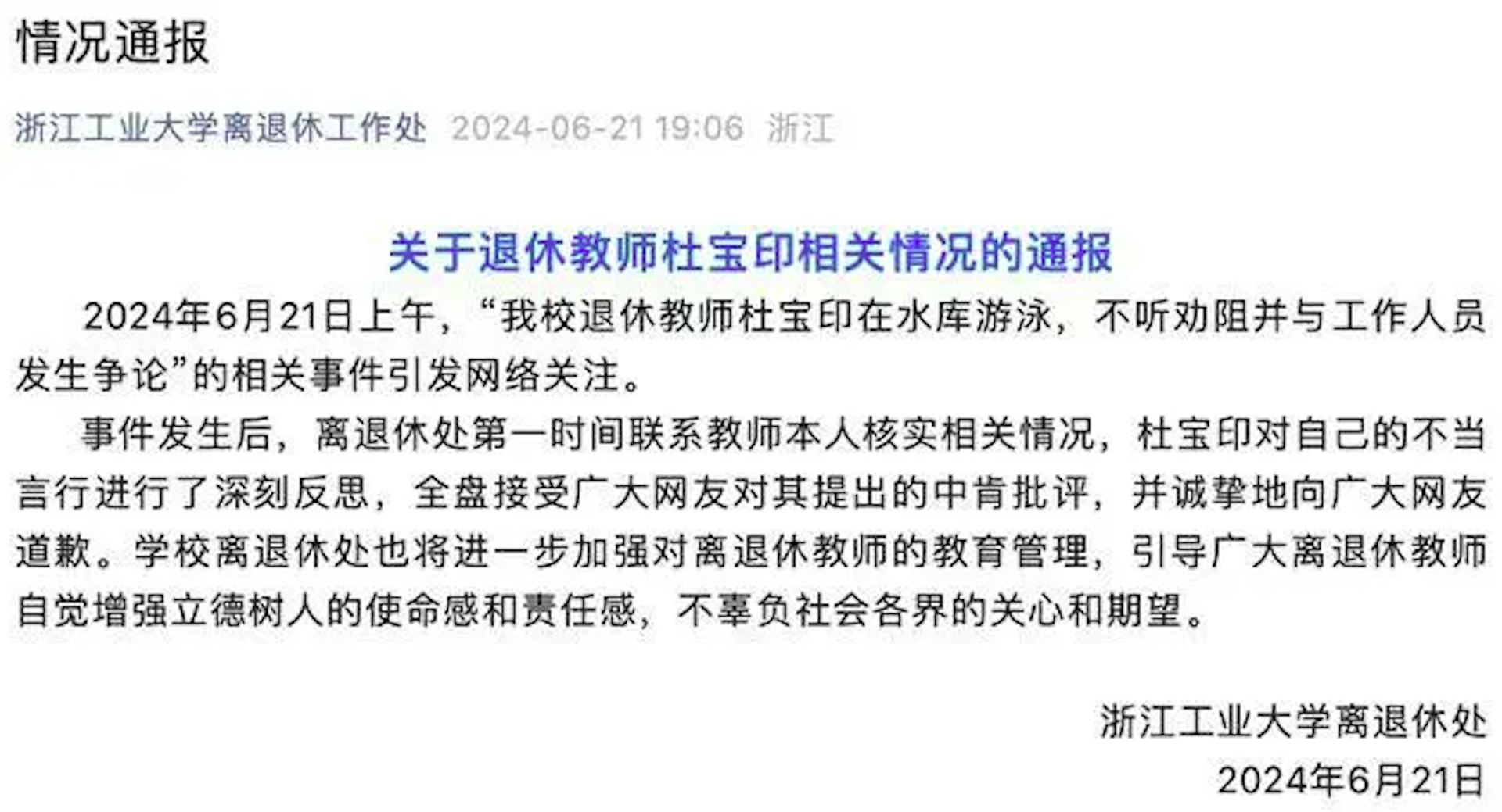 對於事件,浙江工業大學離退休處發布通報稱,事發後,離退休處第一時間聯繫教師本人核實相關情況,杜寶印對自己的不當言行進行了深刻反思,全盤接受廣大網民對其提出的中肯批評,並誠摯地向廣大網友道歉。學校離退休處也將進一步加強對離退休教師的教育管理,引導廣大離退休教師自覺增強立德樹人的使命感和責任感,不辜負社會各界的關心和期望。公仔箱論壇# k5 ^6 n* {0 U8 h7 I7 Z# w/ `