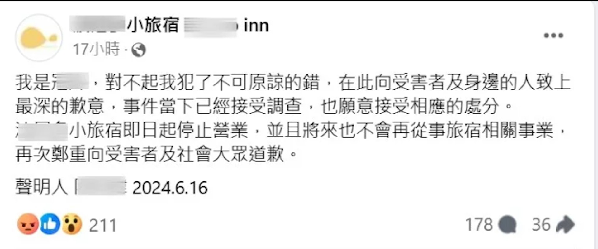 ) X Y( T( ~% }' W: X5 |0 @TVBNOW 含有熱門話題,最新最快電視,軟體,遊戲,電影,動漫及日常生活及興趣交流等資訊。案發後,陳姓負責人立刻在FB上坦承犯案,並向受害者道歉稱「對不起,我犯了不可原諒的錯」,後續將接受調查,也願意接受相應的處分。陳男表示,民宿即日起停止營業,並承諾將來不會再從事旅宿相關事業。案發後,陳姓負責人立刻在FB上坦承犯案。(FB)4 O( D0 {8 O. y( c+ C