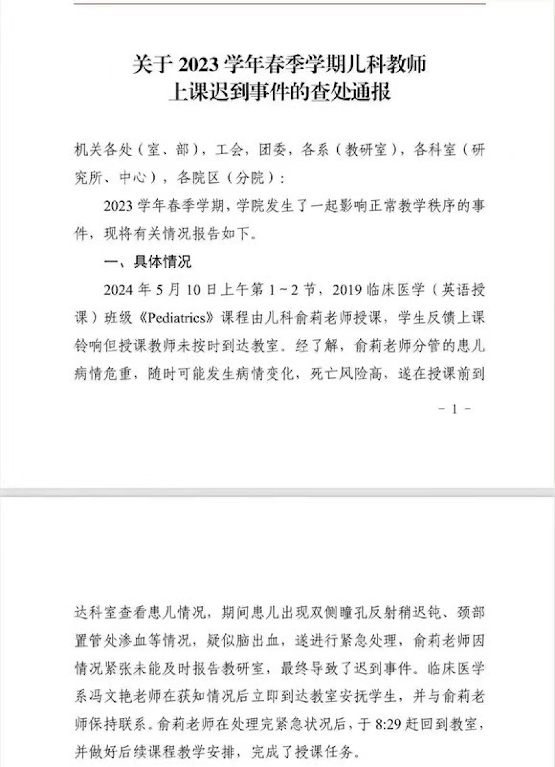 通報顯示,俞莉當天上課前在醫院查看她分管的病童病情,發現其中一人病情危重,疑似腦出血、死亡風險高,留下來緊急處理,因情況緊急未能及時報告教研室。臨床醫學系教師馮文豔獲知情況後立即到教室安撫學生,並與俞莉保持聯繫。